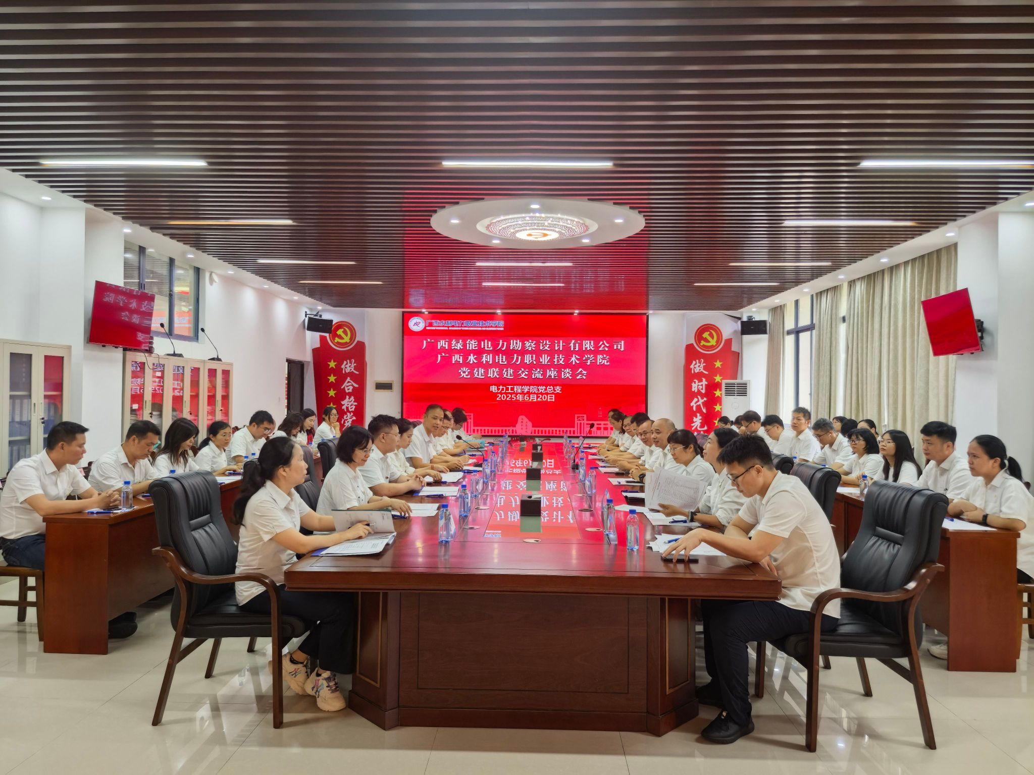 [本网讯]为深化校企党建合作,探索新时代廉洁教育新路径,6月20日,广西绿能电力勘察设计有限公司党支部书记、董事梁庆辉一行30余人来pp电子开展廉洁教育暨党建联建活动,电力工程学院党总支书记罗宇强,党总支副书记、院长左江林等参加了此次活动。本次活动以“校企联建促发展 共筑廉洁正清风”为主题,活动通过实地参观、座谈交流等形式,推动校企双方在党建共建、廉洁教育、产教融合等领域深度合作,构建资源共享、优势互补的党建工作新格局。