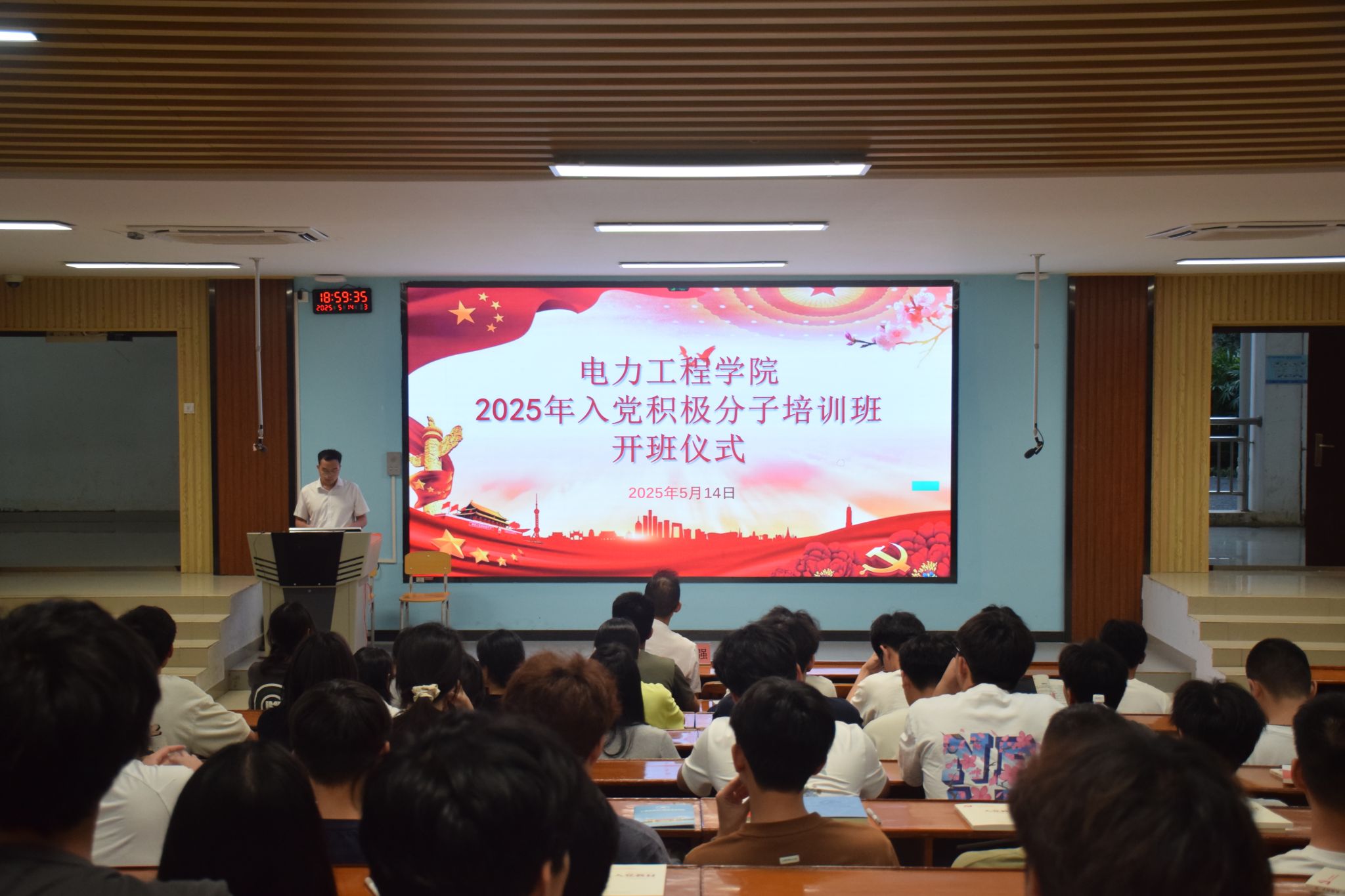 [本网讯]为切实做好入党积极分子的培养工作,提高入党积极分子理论知识水平,确保党员的质量。5月14日,电力工程学院在里建教学楼阶梯101教室举行2025年入党积极分子培训班开班仪式暨首场专题党课。电力工程学院党总支书记罗宇强出席开班仪式,电力工程学院97名入党积极分子参加此次培训。开班仪式由电力工程学院学生党支部宣传委员梁克冬主持。