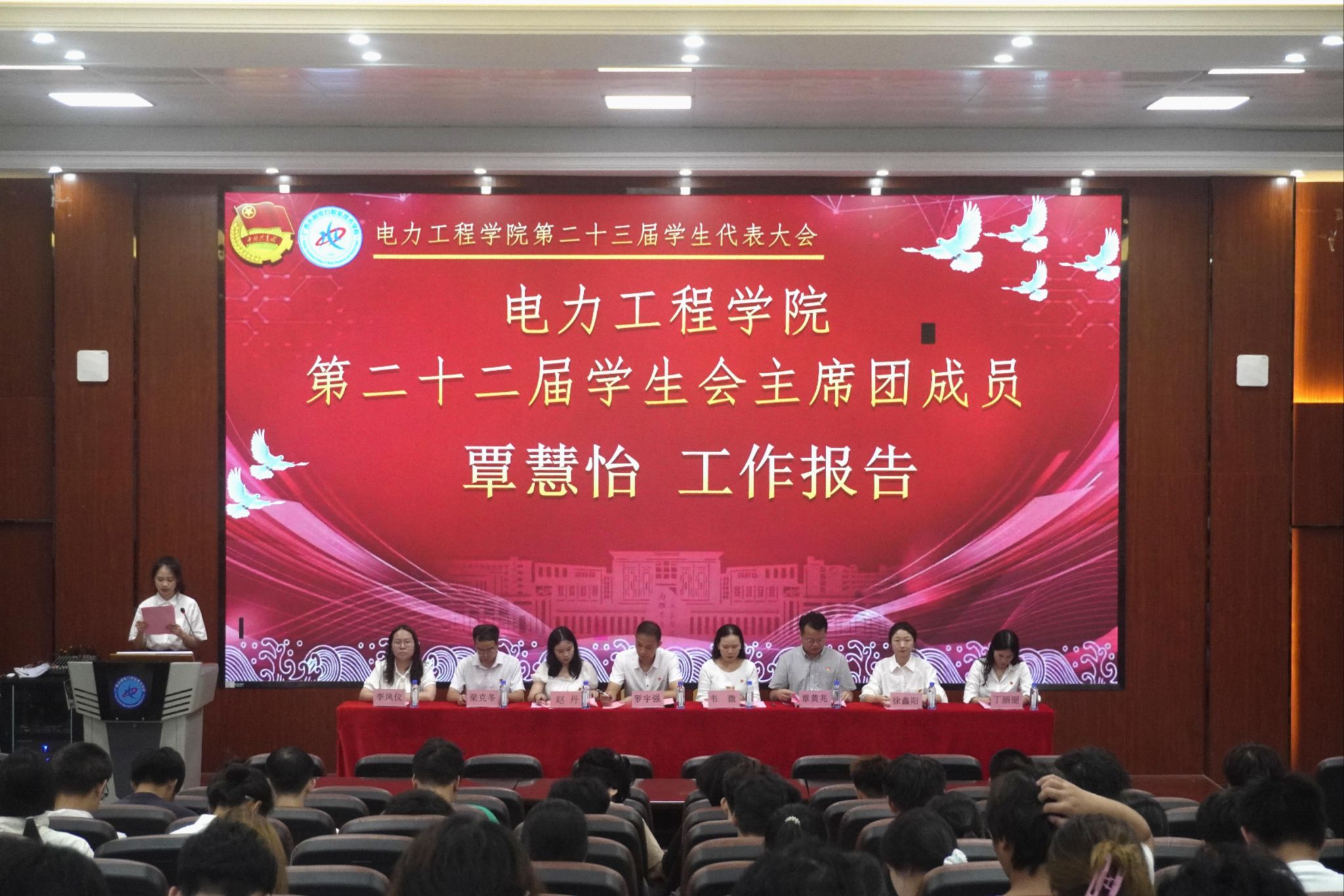 [本网讯]6月26日,电力工程学院在里建校区教学楼二楼学术报告厅召开第二十三次学生代表大会。电力工程学院党总支书记罗宇强、专职组织员赵丹、学校团委干事韦微、自动化工程学院团委书记覃黄兆、电力工程学院团委负责人梁克冬、易班工作站指导老师徐鑫阳、心理辅导站站长李凤仪、蕴电辅导员工作室负责人丁丽丽出席会议,学生代表223人参会。