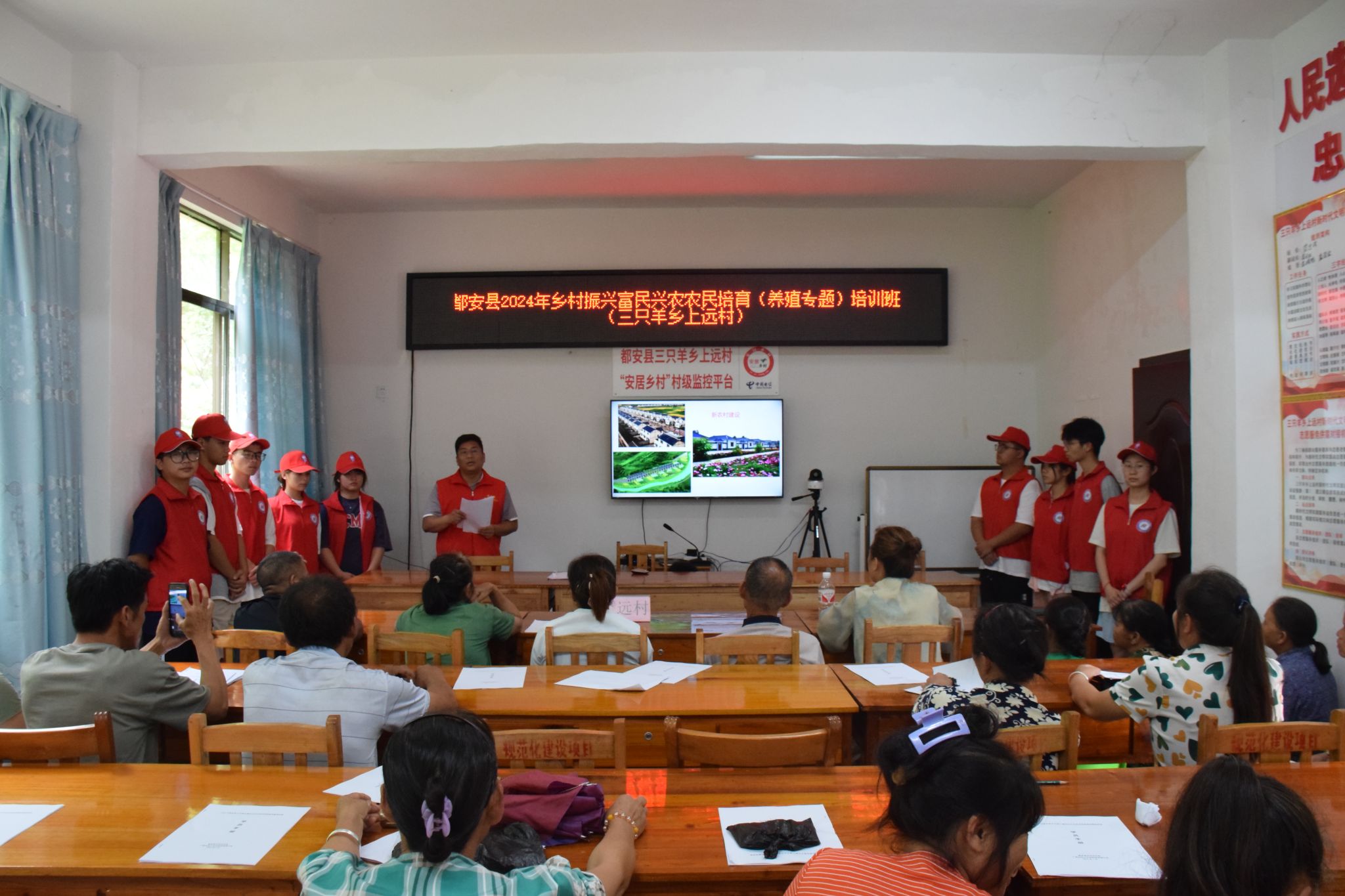 培训班开始前,实践团成员认真组织村民参加培训班,培训采取理论讲授和实践操作相结合的方式进行。培训中,授课老师用通俗易懂的语言对羊的养殖、管理、效益、防疫等多个方面进行了详细的讲解,详细阐述了品种选择、养殖环境、草料饲喂等肉羊繁育注意事项,提出肉羊养殖要做到管理、技术、规模协同发展。在互动环节,根据授课老师的专业解答,实践团成员用地方方言认真解答村民们在养殖过程中出现的各种技术疑难问题,切实提高了村民们发展羊养殖产业积极性,增强了他们科学养殖肉羊的信心。