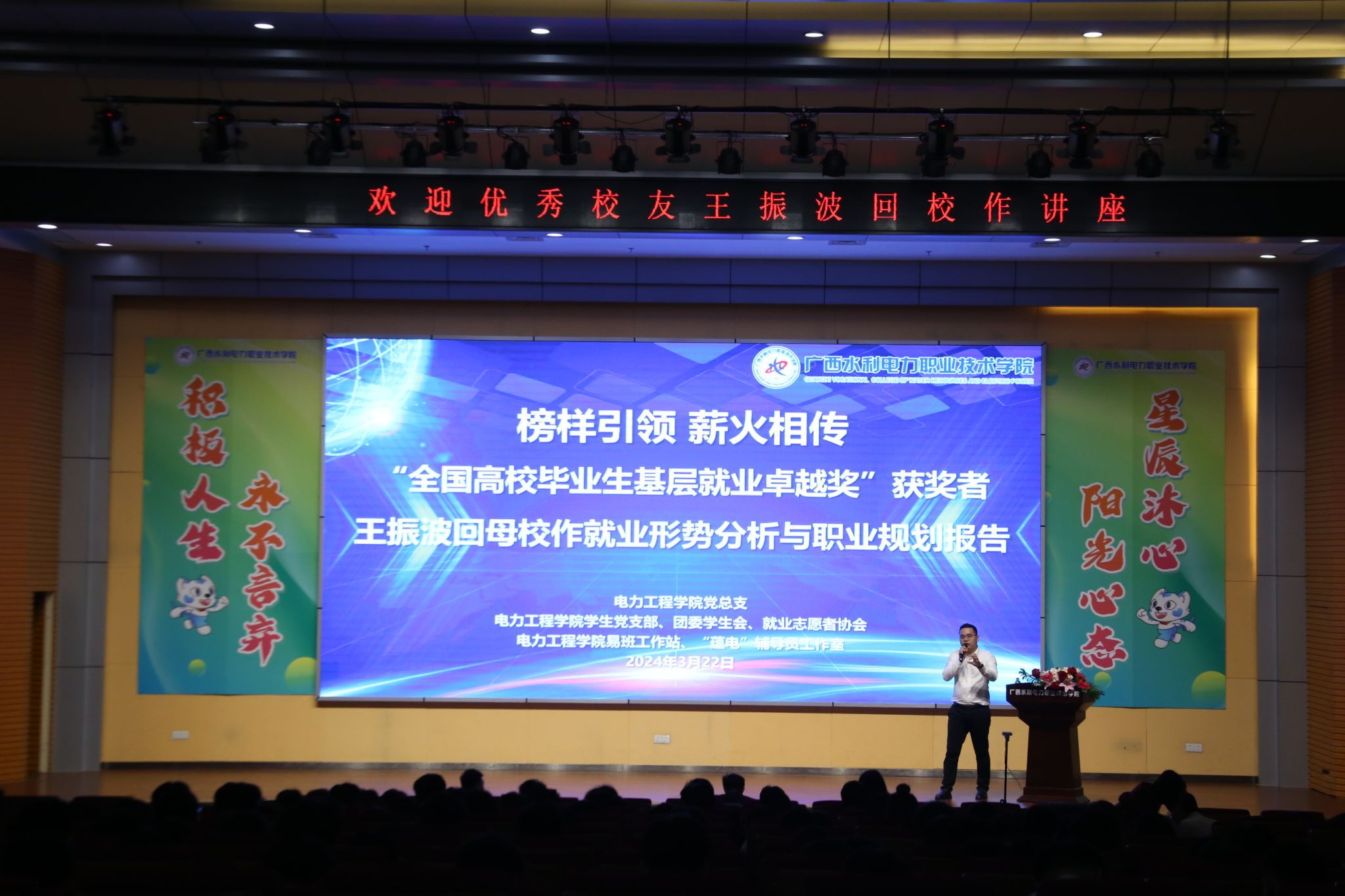 [本网讯]为了引导学生树立正确的就业观和择业观,科学规划职业生涯。3月22日下午,电力工程学院邀请2022年“全国高校毕业生基层就业卓越奖”获奖者王振波回母校作就业形势分析与职业规划报告,2022级400名学生参加现场报告会,2021级、2023级学生参加线上直播报告会,报告会由电力工程学院党总支书记罗宇强主持。