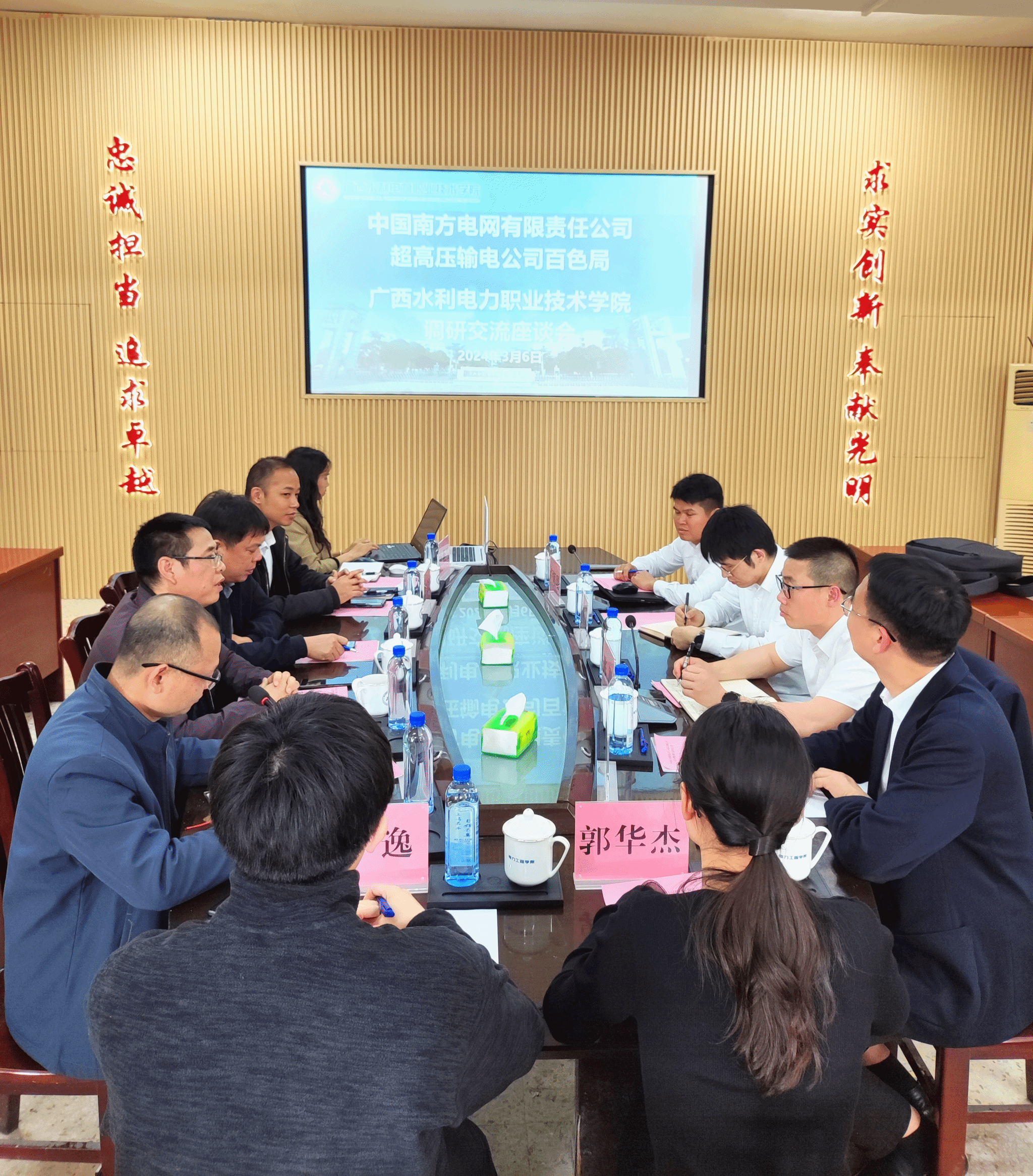 [本网讯]3月6日下午,中国南方电网有限责任公司超高压输电公司百色局生产技术部经理谭威龙、输电管理所经理陈刚、生产技术部科技管理专责陈强、输电管理所技术专家卢辉琨一行四人莅临pp电子开展调研交流,学校继续教育学院院长谭社平、电力工程学院院长左江林、党总支书记罗宇强等参加交流会,会议由电力工程学院副院长徐庆锋主持。