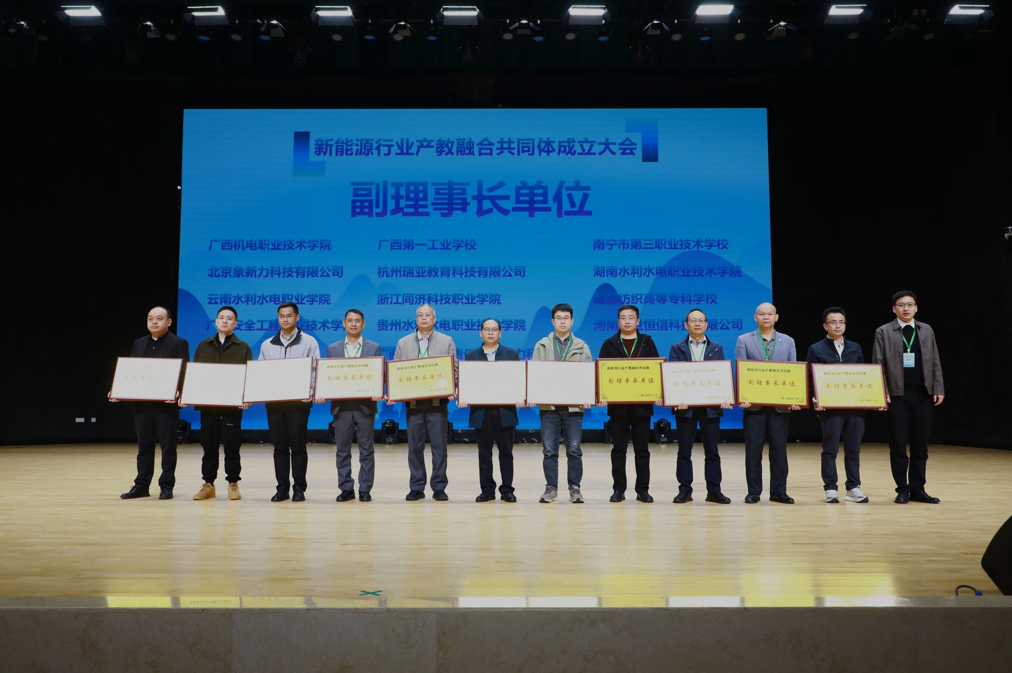 大会审议并表决通过了《新能源行业产教融合共同体章程》,为共同体的健康运行与长远发展奠定了坚实的制度基础。各位领导为理事长、副理事长和理事单位授牌。