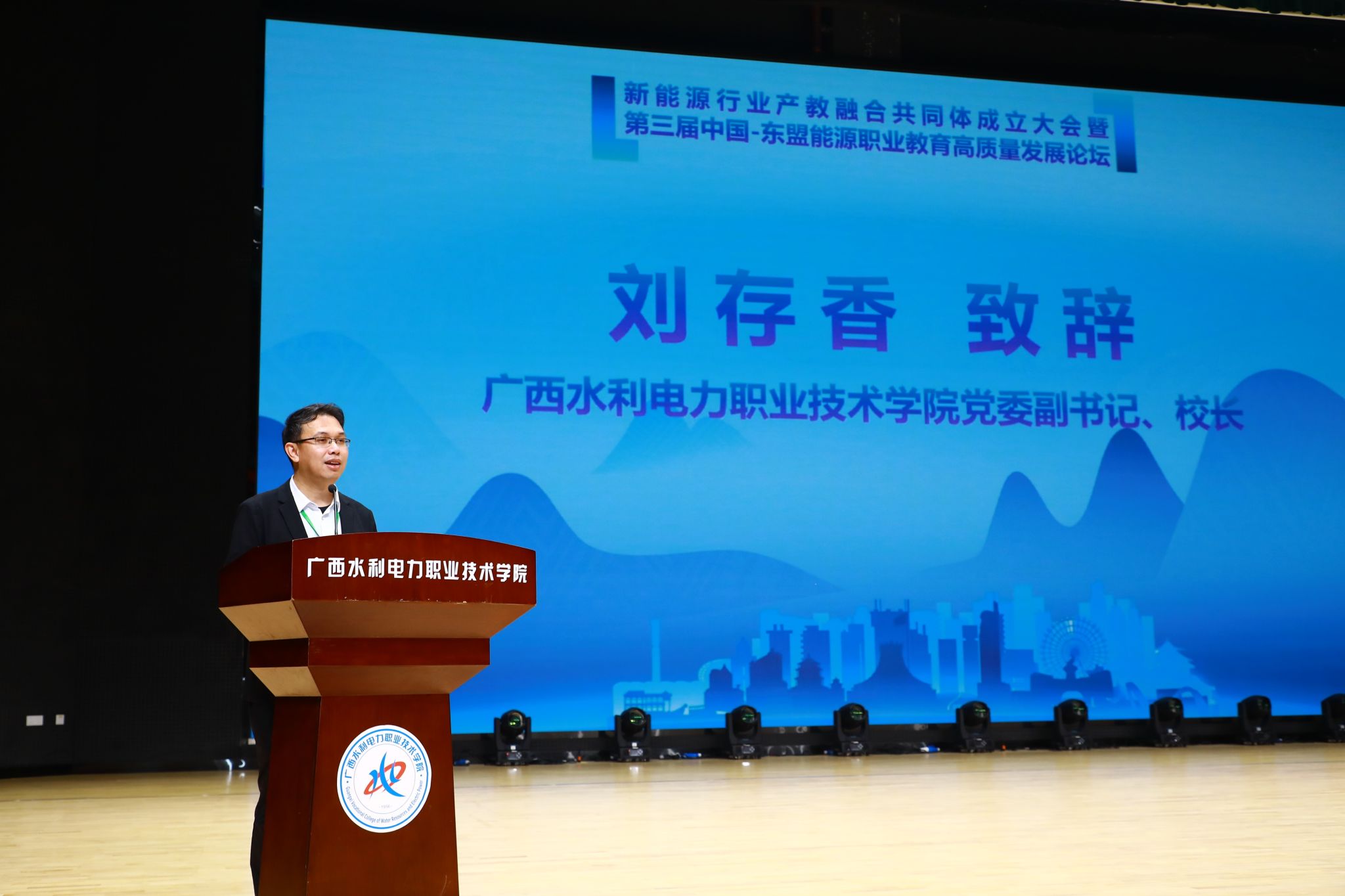 刘存香在致辞中代表学校对与会嘉宾表示热烈欢迎,他强调,成立新能源行业产教融合共同体是对国家“双碳”战略的坚定回应,是秉持“共同建设、共同管理、共享成果、共担风险”的原则,携手各方在产教融合、科教融汇、数字赋能与国际合作中,锻造新能源人才的“硬核力量”。