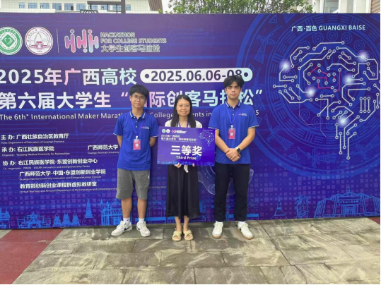 [本网讯]6月7-8日,由广西壮族自治区教育厅主办,广西师范大学、右江民族医学院联合承办的2025年广西高校第六届大学生“国际创客马拉松”活动在右江民族医学院开展。本届活动吸引了来自66所高校的161名师生参与,其中包括23名国际留学生。学校对外交流中心汪谰老师,带领创新创业项目组成员黄宇恒和越南留学生PHAN DUC PHUC参加此次活动。