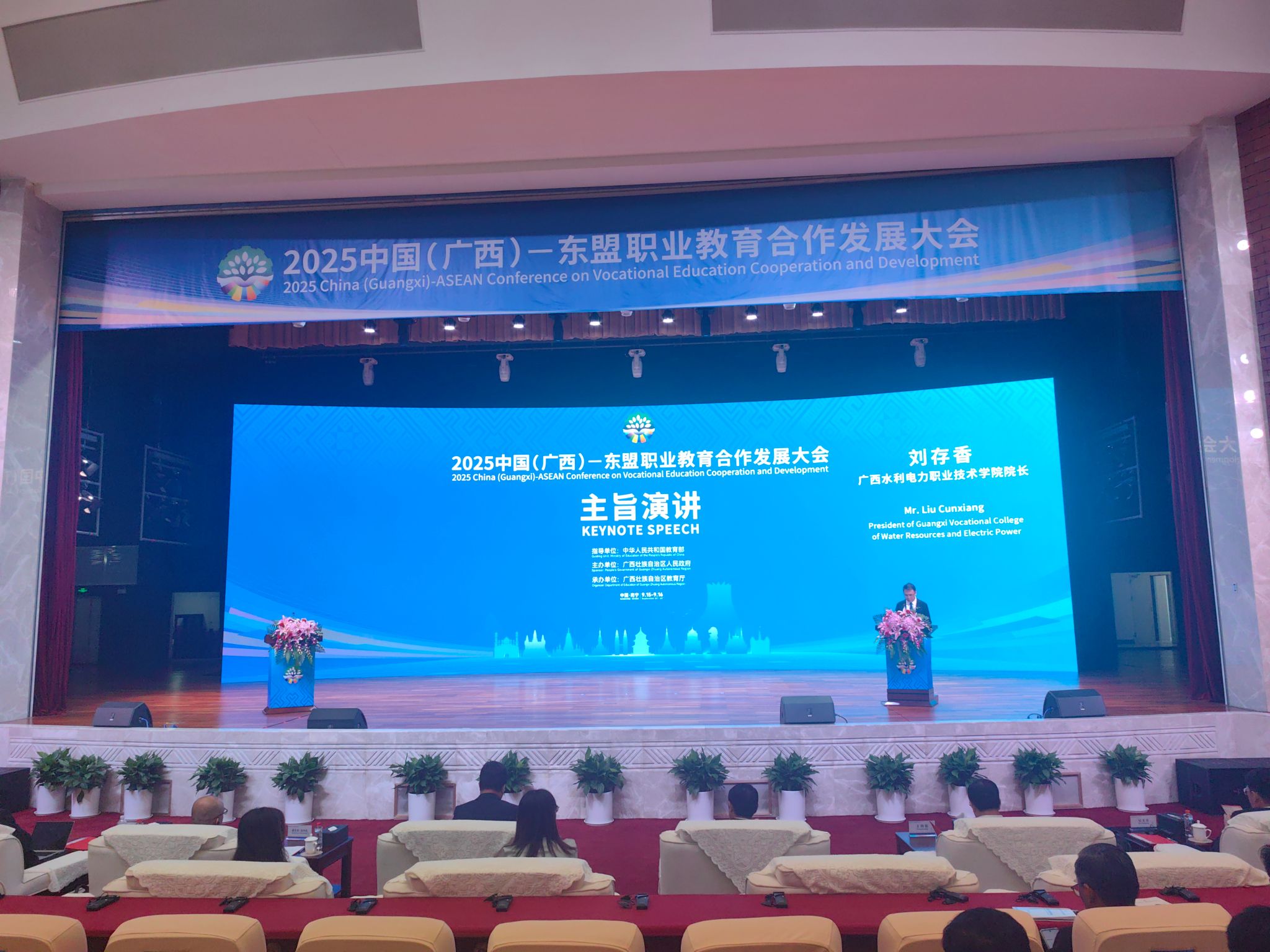 [本网讯]9月15日,2025中国(广西)-东盟职业教育合作发展大会在南宁开幕。学校校长刘存香应邀出席大会,并担任主旨演讲环节主持人。