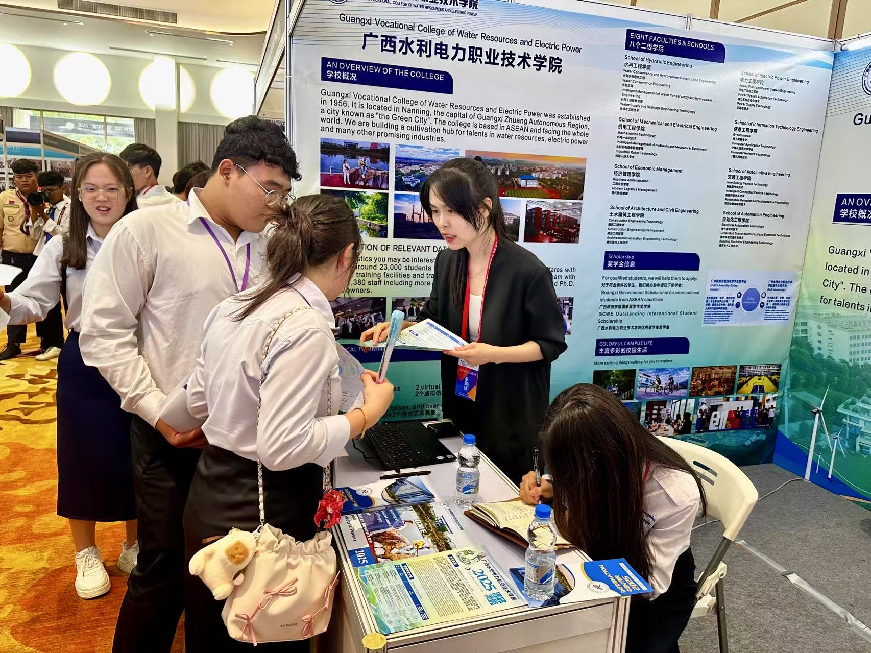 教育展现场,学校展位以“沉浸式体验”为特色,通过面对面专业讲解、可视化宣传资料、全景校园视频及定制化文创纪念品等多元形式,立体呈现“产教融合、实践育人”的办学理念。近百名学生及家长驻足咨询,尤其对水利工程智慧管理、电力系统自动化技术、机器人技术专业、计算机应用技术等特色专业表现出浓厚兴趣。期间,学校还积极宣传“广西政府东盟留学生奖学金”和“pp电子游戏平台官网留学生奖学金”,为东盟国家学生来华留学提供了有力的支持和保障,吸引了大量有留学意向的学生。