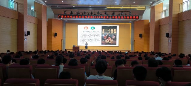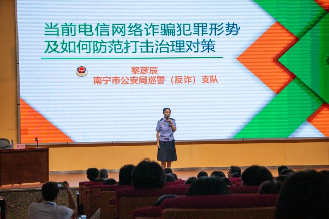[本网讯]9月22日下午,南宁市公安局巡警(反诈)支队联合华侨公安分局、里建派出所一起走进学校,给新生们送上开学防诈骗指南,让同学们擦亮识骗慧眼,小心上当受骗。华侨公安分局副局长黎尚、辖区民警李元生警官、学校学生工作处副处长刘中宽、后勤保卫处陈明老师和近900名师生代表在里建校区图书馆学术报告厅参加了本次活动。