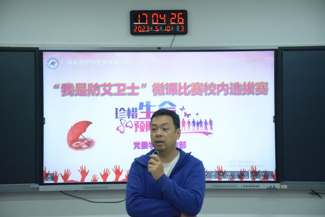 [本网讯]为进一步做好艾滋病防治工作,普及预防艾滋病知识,提高大学生自我保护意识,510下午党委学生工作部长堽校区4教1-3教室举办以我是防艾卫士”为主题的微课比赛校内选拔赛党委学生工作部副部长杨骏出席活动,活动旨在提高师生自觉防艾的社会责任意识,做到知艾防艾科普防艾知识