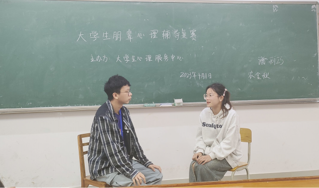 在经过复赛前培训后,同日下午开展大学生朋辈心理辅导技能大赛复赛,复赛内容首先通过自我介绍个人基本信息(如姓名、学院、年级、专业等)以及对朋辈辅导的看法,采用现场模拟方式进行,随后进行模拟心理朋辈辅导,主要考察参赛选手对当事人心理特征与心理困扰的了解把握程度、对当事人的心理辅导能力和解决问题的能力等。在整个比赛过程当中,每位选手有着独特的风格,发挥自己的长处,生动演绎出朋辈心理辅导的过程,展现出朋辈心理辅导独特的魅力。