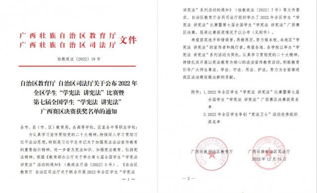 [本网讯]为深入学习贯彻习近平法治思想,由广西壮族自治区教育厅、自治区司法厅主办、广西师范大学承办的第届全国学生“学宪法 讲宪法”广西赛区选拔赛2022811月举行。pp电子近日自治区教育厅公布2022年全区学生“学宪法讲宪法”比赛暨第七届全国学生“学宪法 讲宪法”广西赛区决赛获奖名单,分别荣获高校组“学宪法 讲宪法”活动知识竞赛优秀奖2022年全区学生争创“宪法卫士”活动优秀组织奖。