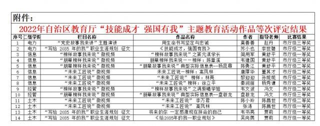 [本网讯]近日,教育厅印发了《关于公布“技能成才 强国有我”主题教育活动作品等次评定结果的通知》(桂教职成〔2022〕73号),pp电子推荐的14项作品获奖,其中一等奖4项,二等奖7项,三等奖3项。本次活动,pp电子以“技能成才 强国有我”主题教育活动为载体,全面推动开展形式多样、丰富多彩的德育实践活动,扎实推进文化育人、实践育人、活动育人,促进学生全面发展,严格落实立德树人根本任务。
