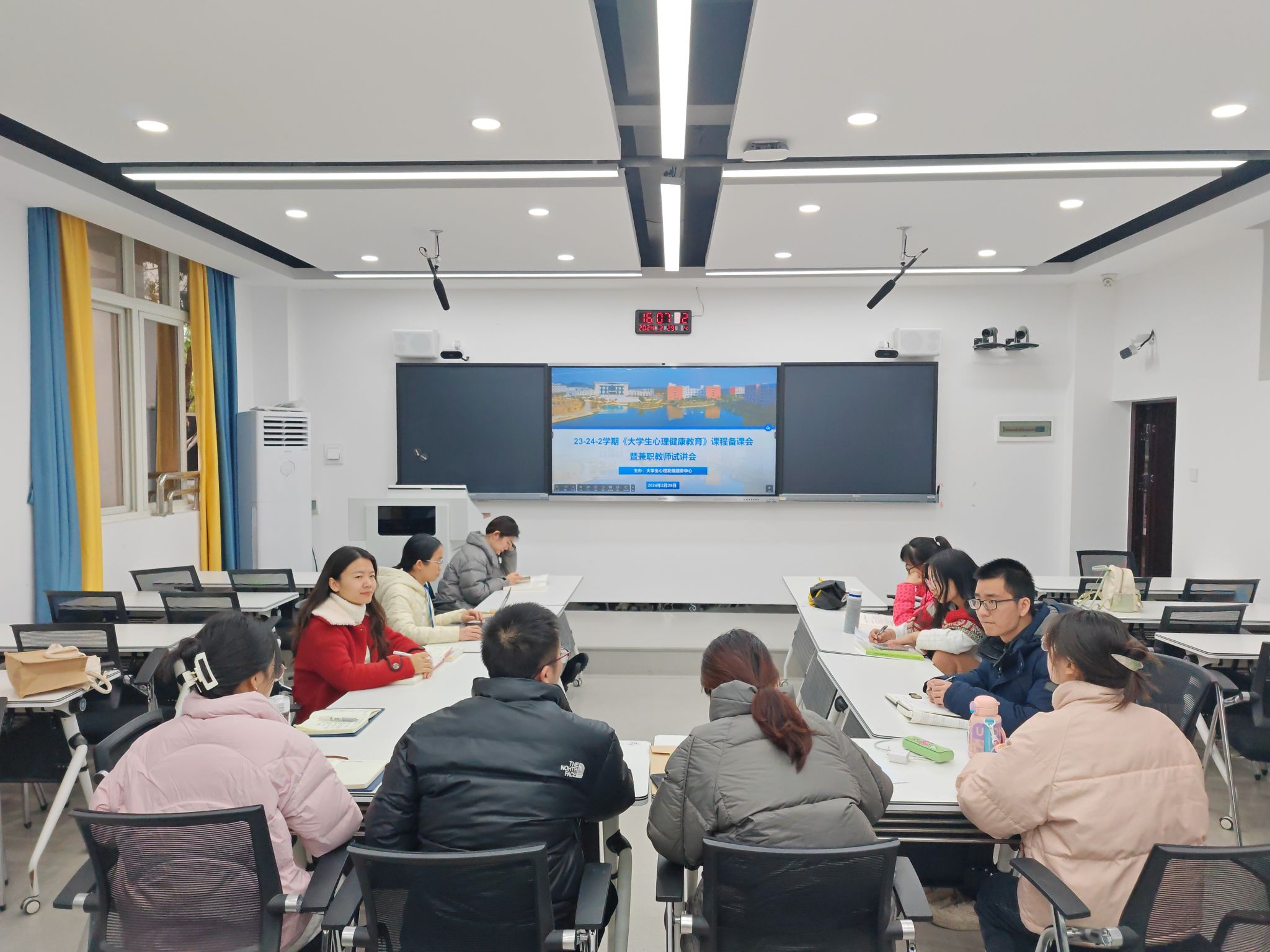 [本网讯]为进一步加强心理健康教育师资建设、持续提升教学质量、提升教学能力,更好地发挥大学生心理健康教育课程的主渠道作用,促进学生身心健康成长,同时为新学期教学工作做准备。2月29日,党委学生工作部(处)大学生心理发展服务中心组织开展2023-2024春季学期《大学生心理健康教育》备课会暨兼职教师试讲会。13名专兼职心理教师参加本次备课会。