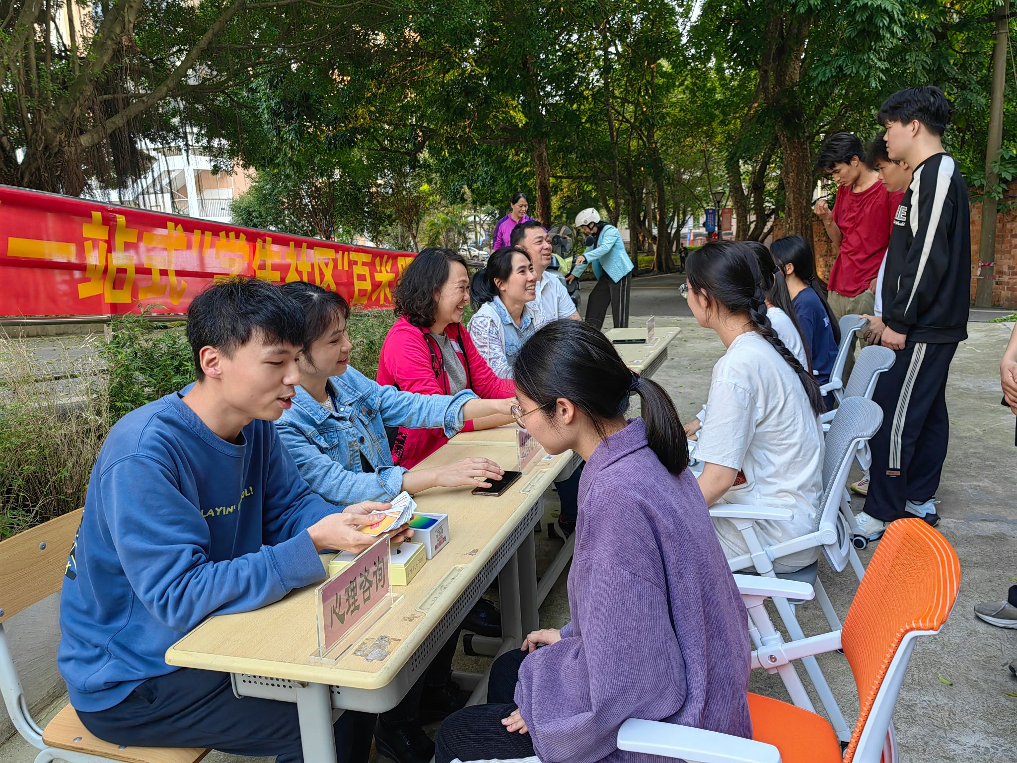 活动现场,“文明集市”人气满满。在政策咨询区,学工部党支部党员热心耐心为同学们讲解资助、学生管理、评奖评优、征兵入伍等文件政策;在社区服务区,爱心志愿者协会、计算机协会、融媒体中心等社团志愿者们提供了拍照、理发、眼镜清洗、自行车清洗等服务;在宣传科普区,华侨城社区社工、里建派出所民警、国旗队围绕着网络诈骗特征与手段、防范诈骗的应对方式,及如何维护自身合法权益等,与同学们面对面交流,提醒同学们防范电信网络诈骗;在心理健康区,大学生心理发展服务中心教师将“心理健康的标准”“心理健康的情绪标准”“出现心理异常如何面对”等专业的心理健康知识制作成宣传页分发。现场还播放了《雷锋的微笑》专题电影,专门设置多个志愿者报名点位,吸引更多同学加入志愿者行列,共同传递新时代的雷锋精神。