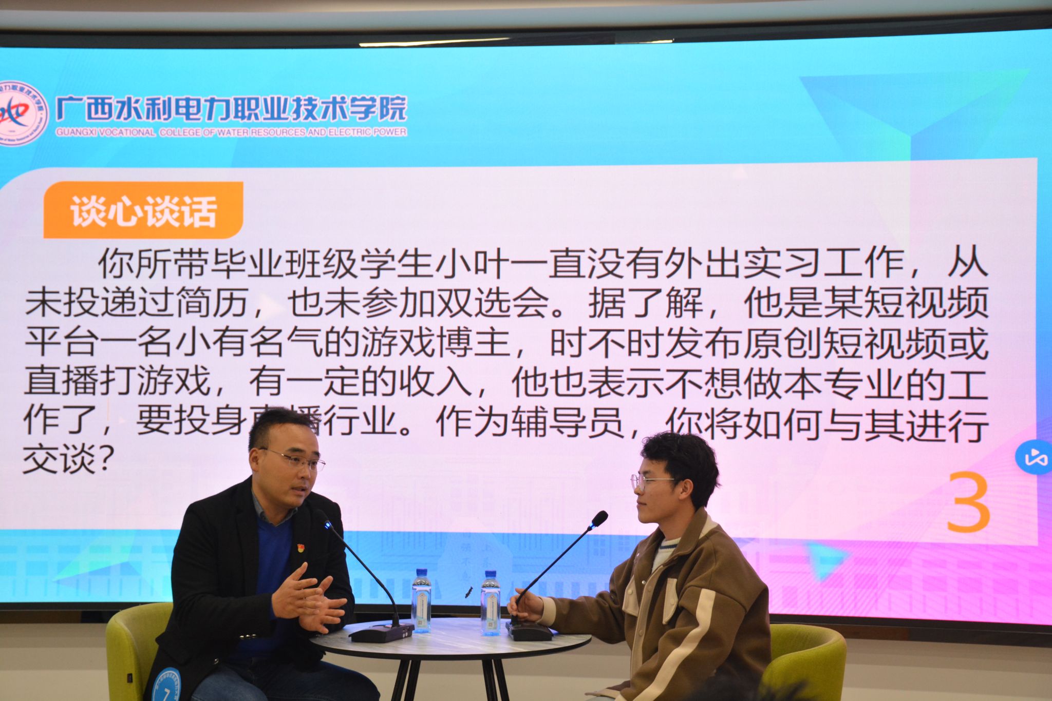 广西职业技术学院党委学生工作部(处)部(处)长周新韶、广西工商职业技术学院党委学生工作部(处)部(处)长林雯、广西国际商务职业技术学院党委学生工作部(处)部(处)长樊永生、学校党委宣传部部长唐亮、党委学生工作部部长李晓红、后勤管理处处长余娜、马克思主义学院院长李春萌担任大赛评委。(危雲/文 雷晓芳/图)