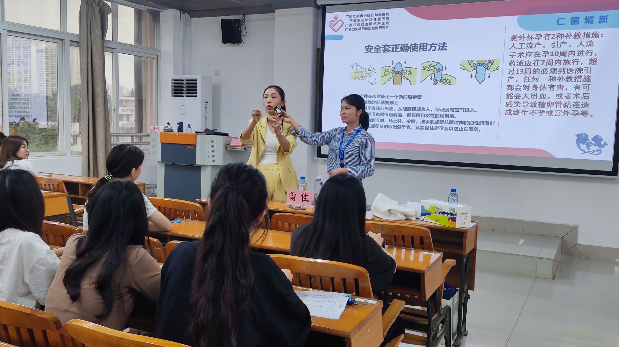 活动上,广西壮族自治区妇幼保健院主治医师雷佳分别从胎儿发育、乳房发育、女性生理期、两性生活、人工流产、有效避孕等女性青春期保健知识进行宣讲,并详细介绍了宫颈癌的临床表现、预防和治疗,普及“两癌”筛查政策,让同学们认识到“两癌”筛查的重要性,让国家的民生工程惠及更多群众,倡导大家养成健康的生活方式,定期进行健康体检和“两癌”筛查,做到妇科疾病的早检查、早发现、早治疗,降低安全隐患,提高女性健康水平。宣讲结束后,支部党员为现场的百名女生发放安全套,并组织学生学习安全套的正确使用方法。