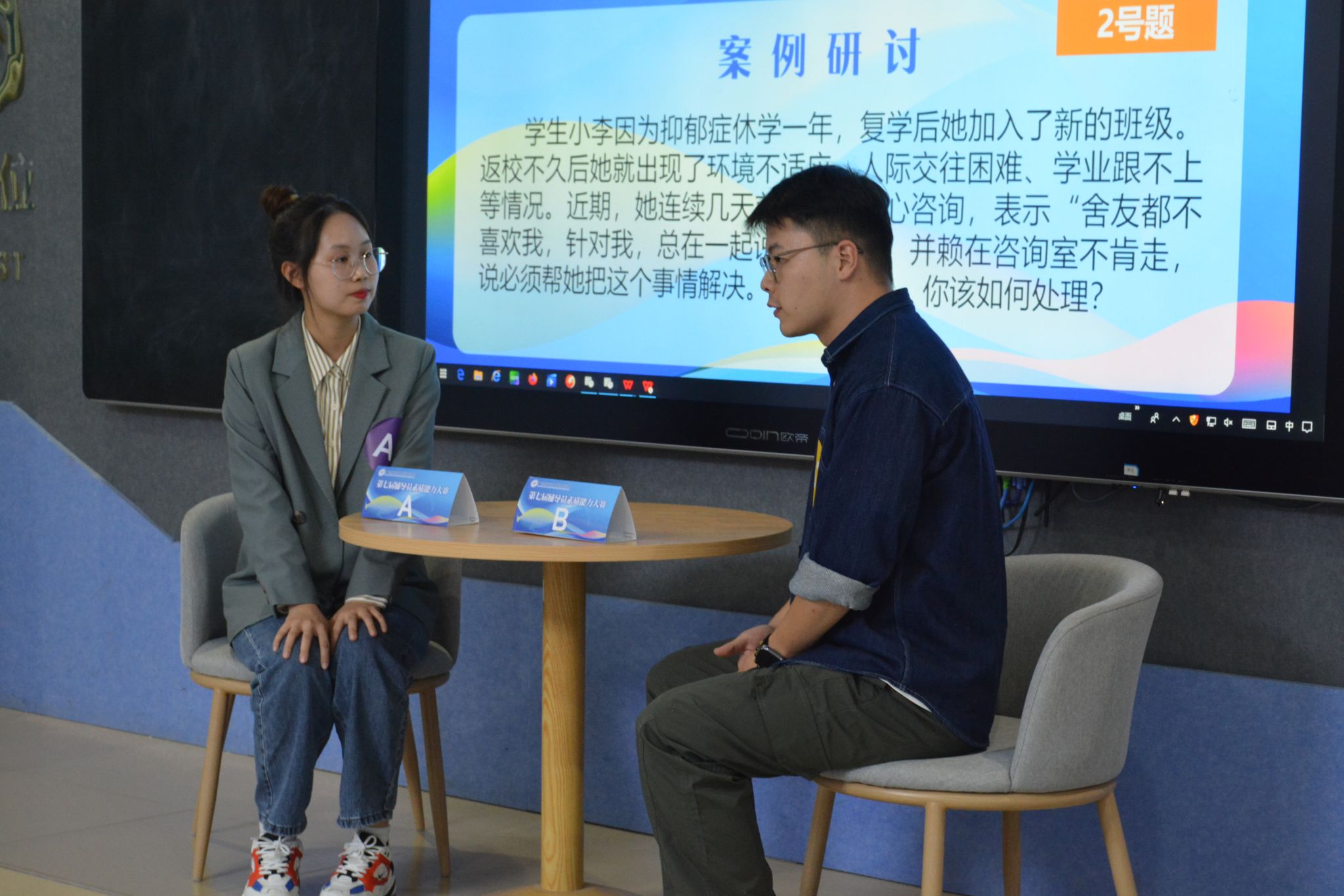 大赛分为基础知识测试、案例研讨和谈心谈话三个环节,主要考察辅导员综合运用理论分析问题、研判问题、解决问题等能力,以及对辅导员岗位职责和职业角色的认知。案例研讨环节中,参赛选手两两分组,在个人阐述和互相提问中,共同剖析案例问题、探索解决之道、研究实施策略,针对案例抽丝剥茧,层层深入,展现出良好的现场应变和逻辑思辨能力。谈心谈话环节中,辅导员们动之以情、晓之以理,围绕思想引领、身心健康、成长支持、日常管理等各方面现实问题与学生进行交流谈心,引导学生正确认识问题、分析问题和解决问题。辅导员们在各环节中稳扎稳打,展示了良好的理论功底、扎实的实践工作能力和昂扬的精神面貌。经过激烈的角逐,最终评出了一等奖4名,二等奖6名,三等奖8名。