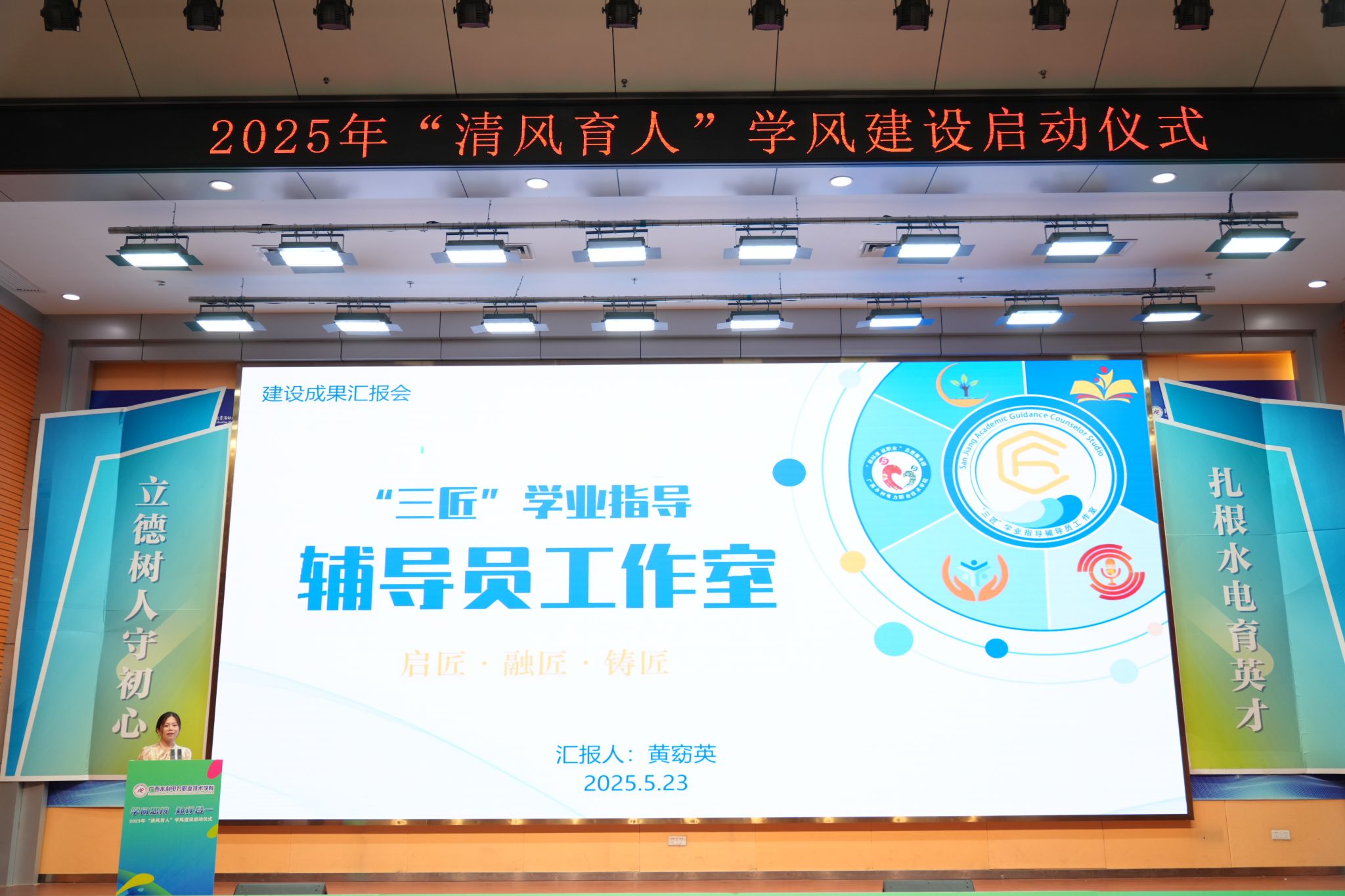 在成果展示环节,第二届全国大学生职业规划大赛职教组成长赛道铜奖获得者崔智和同学分享了职业探索经验;国家奖学金获得者俸琪琦同学讲述了学业与实践的奋斗故事;广西高校辅导员年度人物黄窈英介绍了“三匠”辅导员工作室的育人经验,展现了学校在学生成长与学风建设中的阶段性成果。