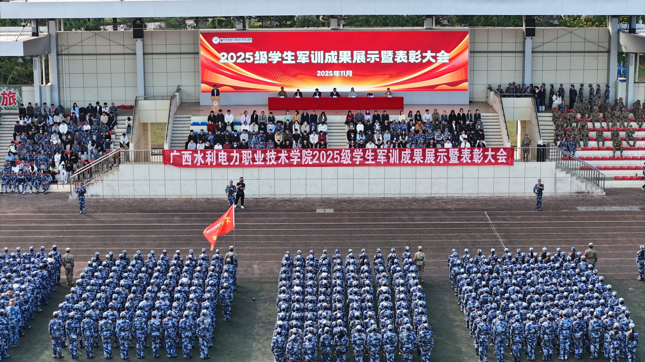 会上,学校党委书记李林、校长刘存香分别作军训总结讲话。学校领导深情回顾了十四天军训的动人历程,教官们以身作则、耐心施教,以汗水诠释纪律与担当;辅导员与学工老师们全程陪伴、默默守护,提供了坚实的后勤保障与温暖的关怀;而全体参训同学不畏挑战、迎难而上,在磨砺中成长,展现出卓越的精神风貌。结合纪念中国人民抗日战争暨世界反法西斯战争胜利80周年的特殊历史节点,学校领导对2025级学生提出三点希望:一是希望同学们铸牢信念之基,将爱国情、强国志、报国行自觉融入学习技能、锤炼本领的具体实践中,书写水电学子的无悔青春;二是希望同学们延续优良之风,将守时、守纪、坚韧、担当等优秀品质延续到未来的学习和生活中,为个人的职业成长奠定坚实基础;三是希望同学们珍惜团队之力,将军训中凝聚的归属感和团队精神带入到班级、宿舍、校园,共建温暖的集体。