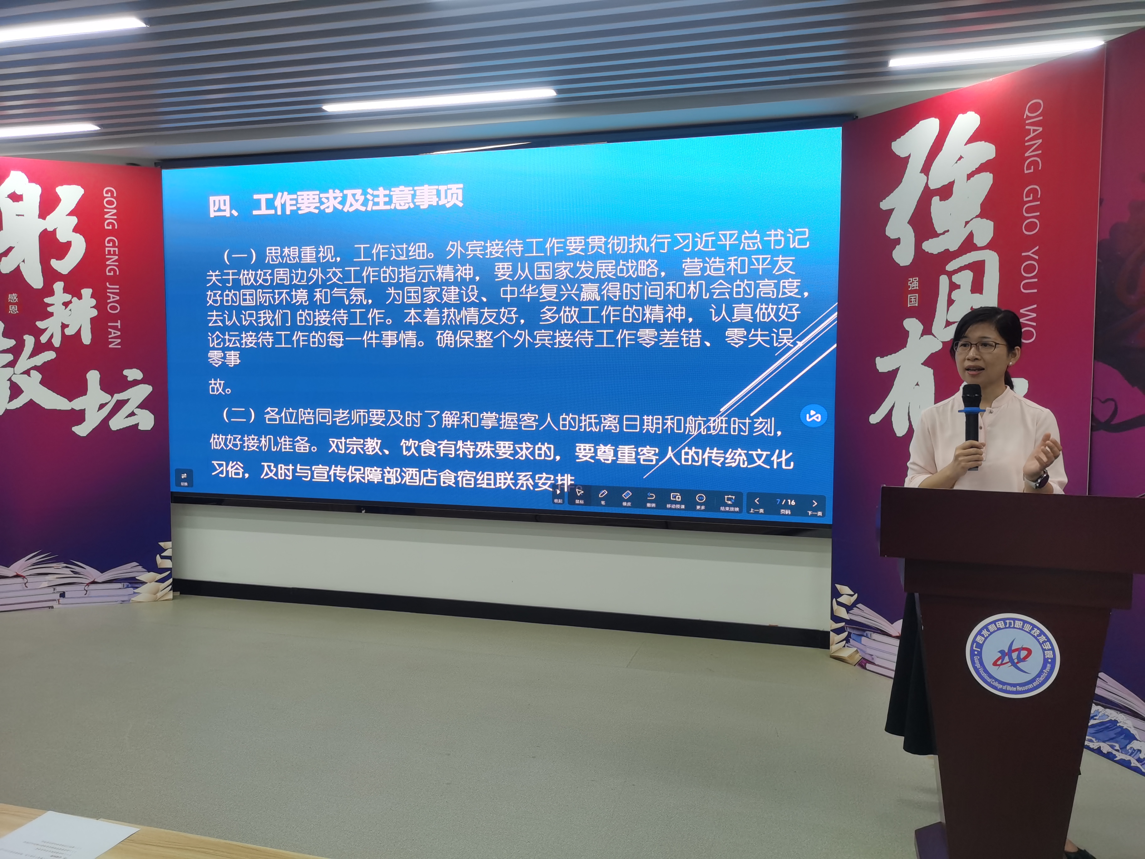 区倩如处长从学校平行论坛基本情况、自治区中国-东盟职业教育联展暨论坛的主要活动及安排、学校接待任务分工及安排、工作要求四个方面对全体接待人员进行了工作实务培训和任务传达,详细、准确地转达了接待工作各项要求。