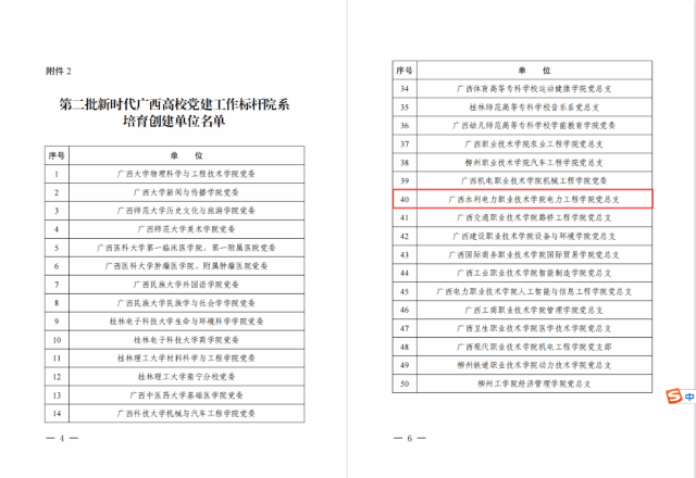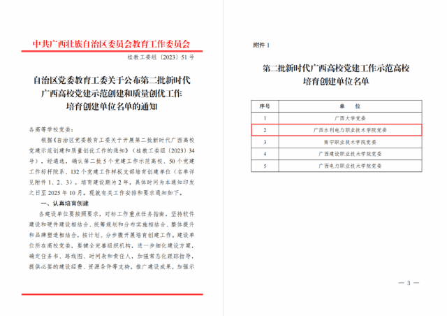 [本网讯]近日,自治区党委教育工委印发《自治区党委教育工委关于公布第二批新时代广西高校党建示范创建和质量创优工作培育创建单位名单》(桂教工委组〔2023〕51号),学校申报的第二批新时代广西高校党建“双创”项目全部获批!其中学校党委获批党建工作示范高校培育创建单位(全区共5所高校党委入选,pp电子党委在高职院校中排名第一),电力工程学院党总支获批党建工作标杆院系培育创建单位,水利工程学院教工第一党支部和经济管理学院教工党支部获批党建工作样板支部培育创建单位。