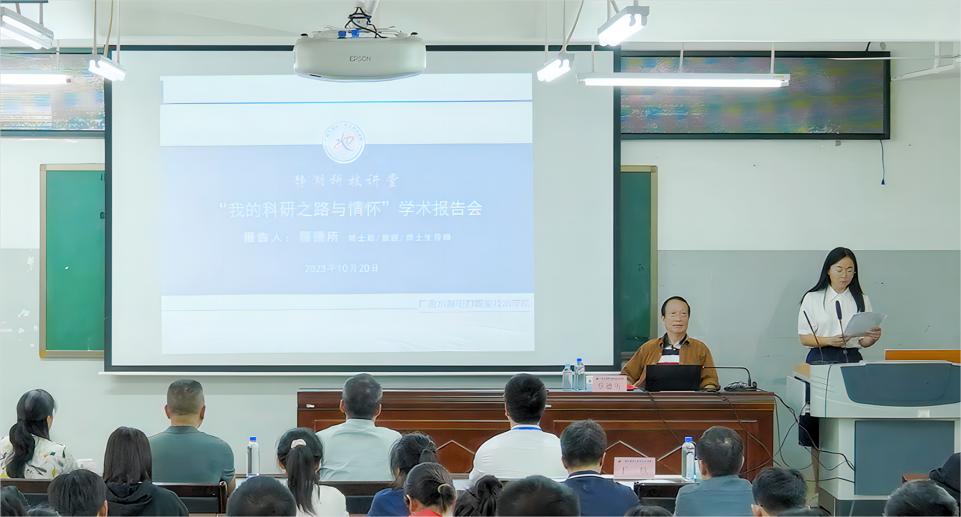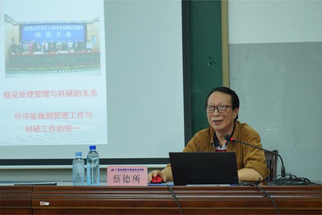[本网讯]10月20日下午,学校举办“静湖科技讲堂”学术报告会,会议邀请原广西水利厅副厅长,教授、博士生导师蔡德所,就“我的科研之路与情怀”主题做报告。报告会由发展规划与科技开发处副处长丁欣主持,学校副校长周涛,水利厅离退休人员工作处处长梁卫东、副处长罗萍,学校工会副主席许兵兵、学校博士等100多位教师参会。