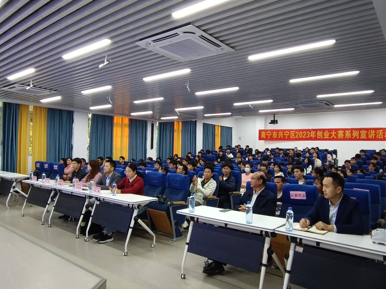 [本网讯] 11月17日下午,南宁兴宁区创业大赛组委会应邀来校开展创业知识讲座。讲座主讲分别是广西零壹增长信息技术有限公司创始人罗超林和广西火炬创业导师颜新秀。学校发展规划与科技开发处及各二级学级老师,10余家企业代表,参赛选手150余人参与了讲座活动。
