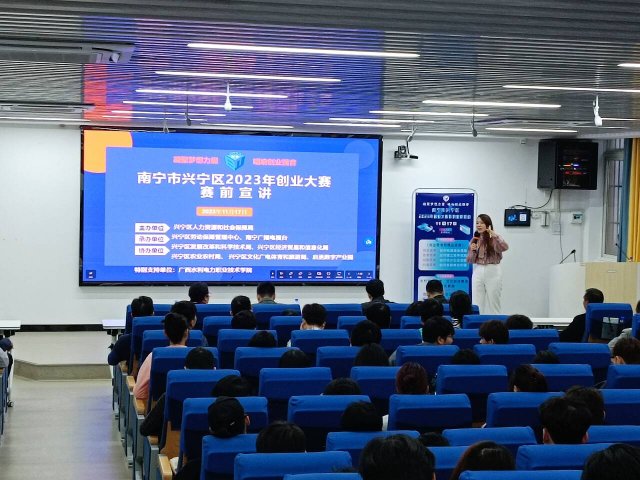 广西火炬创业导师颜新秀作了2023年兴宁区创业大赛的赛前宣讲。她的宣讲题目是《凝聚梦想力量 唱响创业强音》。她从赛事背景、参赛收获、大赛介绍、参赛准备、参赛代表和创业政策6个方面向师生全面介绍2023年兴宁区创业大赛的情况,希望水电的学子积极报名参赛。同时,她还向师生们展示了历届兴宁区创业大赛上的获奖作品。