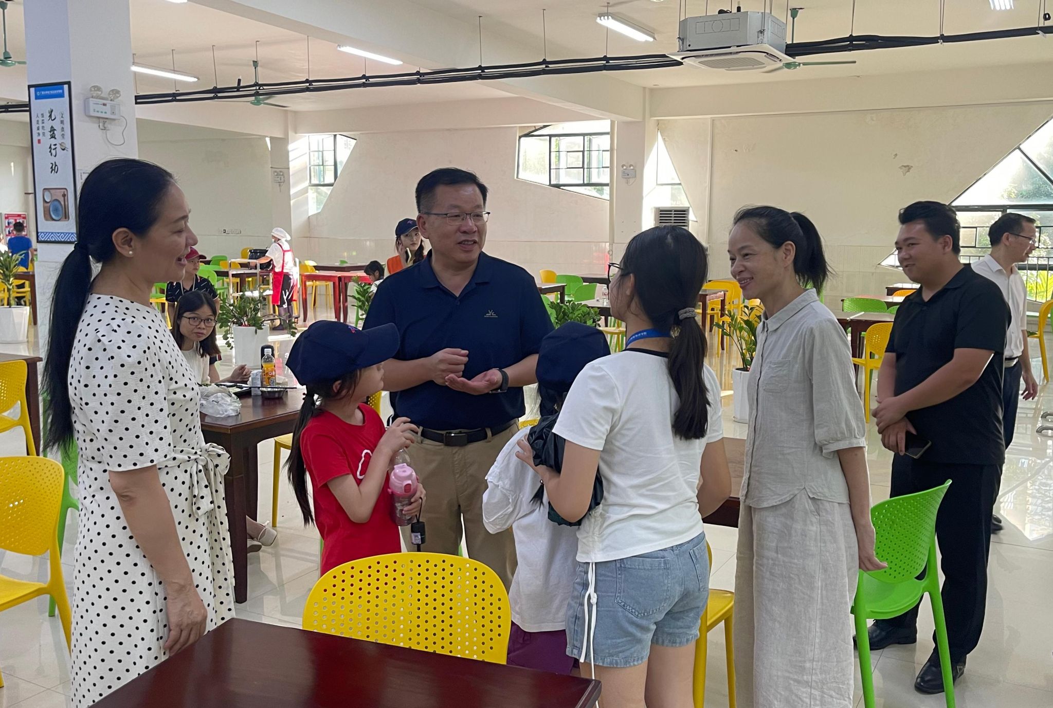 学校党委书记李林、党委副书记莫海燕与研学的中小学生交流