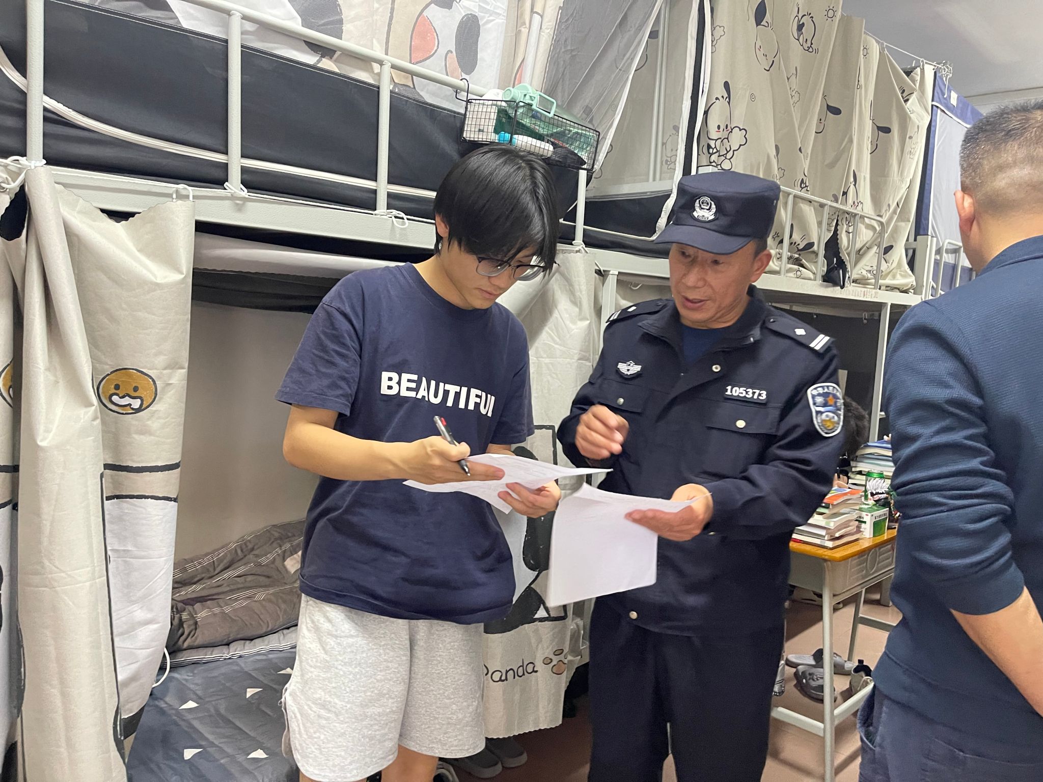 检查组深入黄河阁、长江阁,对学生宿舍逐一进行检查,重点排查管制器具、违规用电现象等。与此同时,派出所民警同步开展反诈宣传工作,向同学们发放了反诈宣传单,组织同学们填写涵盖防范电信网络诈骗、校园欺凌、矛盾纠纷等内容的调查问卷。