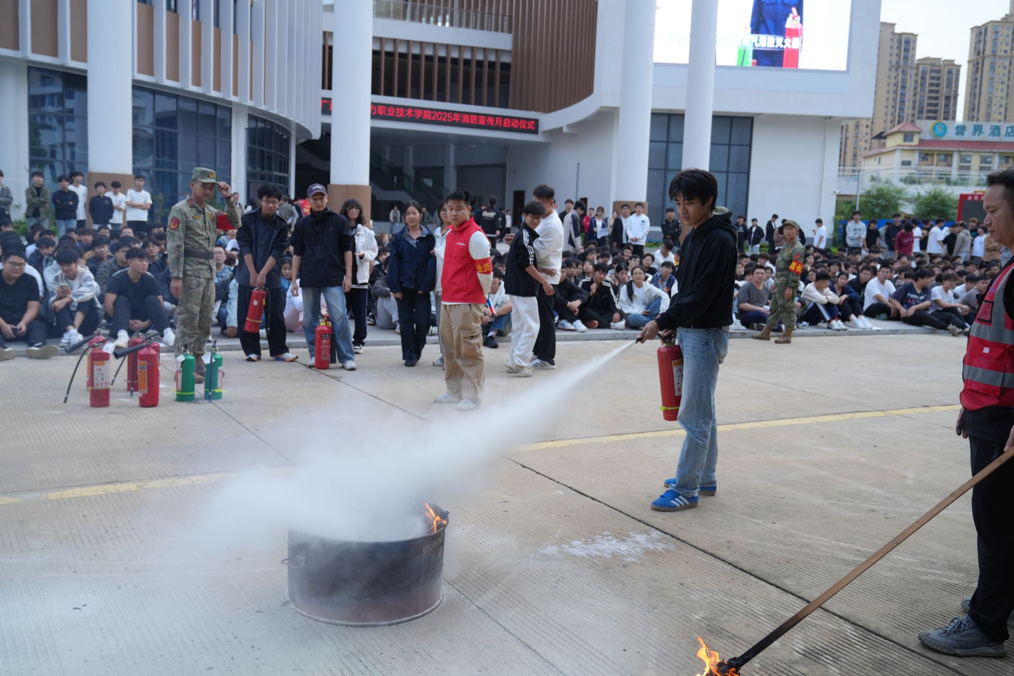 学校各相关部门及二级学院负责人、广西-东盟经济开发区消防救援大队工作人员以及6000余名师生参加活动。(彭婕英/文 黄丹虹/图)