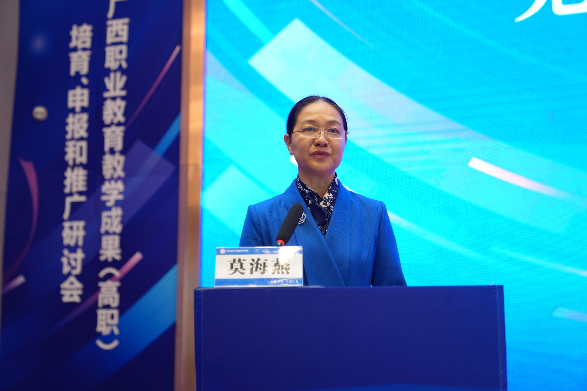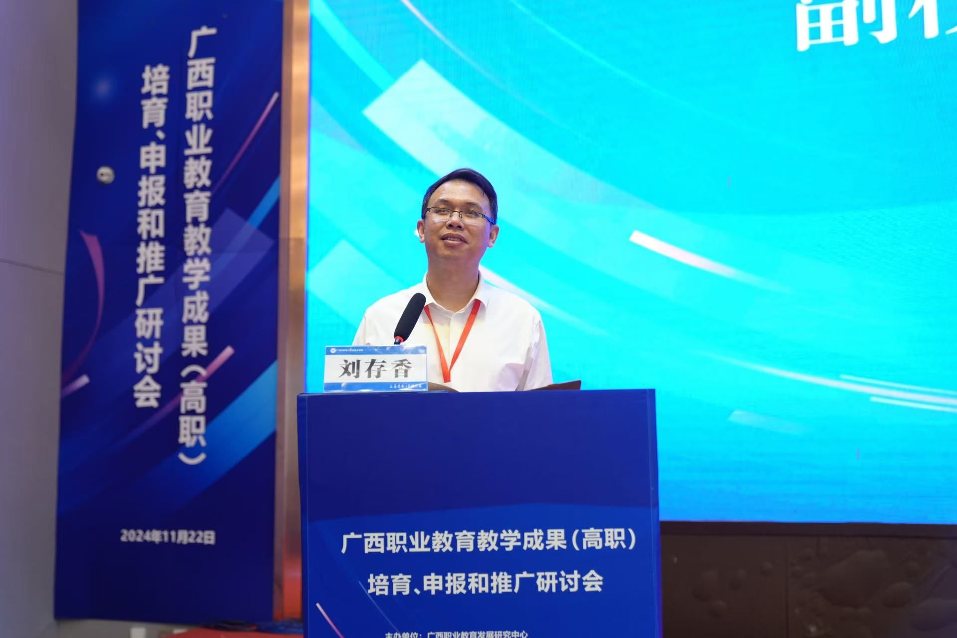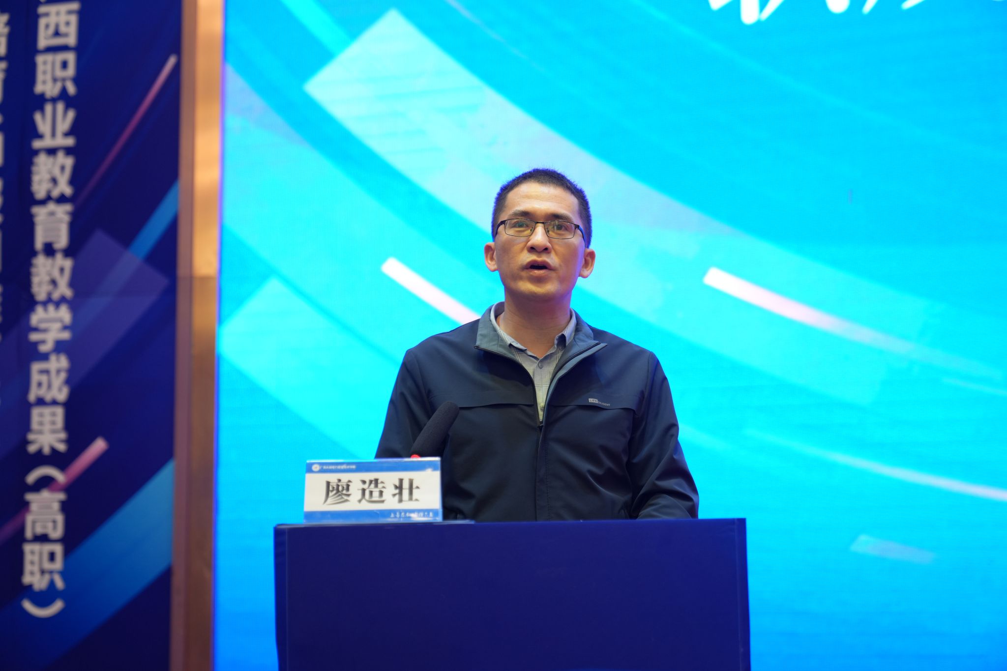 广西壮族自治区教育厅职成处副处长廖造壮在讲话中强调,自治区教育厅一直以来高度重视职业教育教学成果奖的培育与推广,并指出了我区职业教育教学成果培训、申报工作的经验和不足。他希望获奖成果的经验分享能够激励、引领广西的职业院校同仁们,在未来的教学教研工作中锤炼精品,追求卓越,追求创新,形成更多具有广西特色的教学成果。