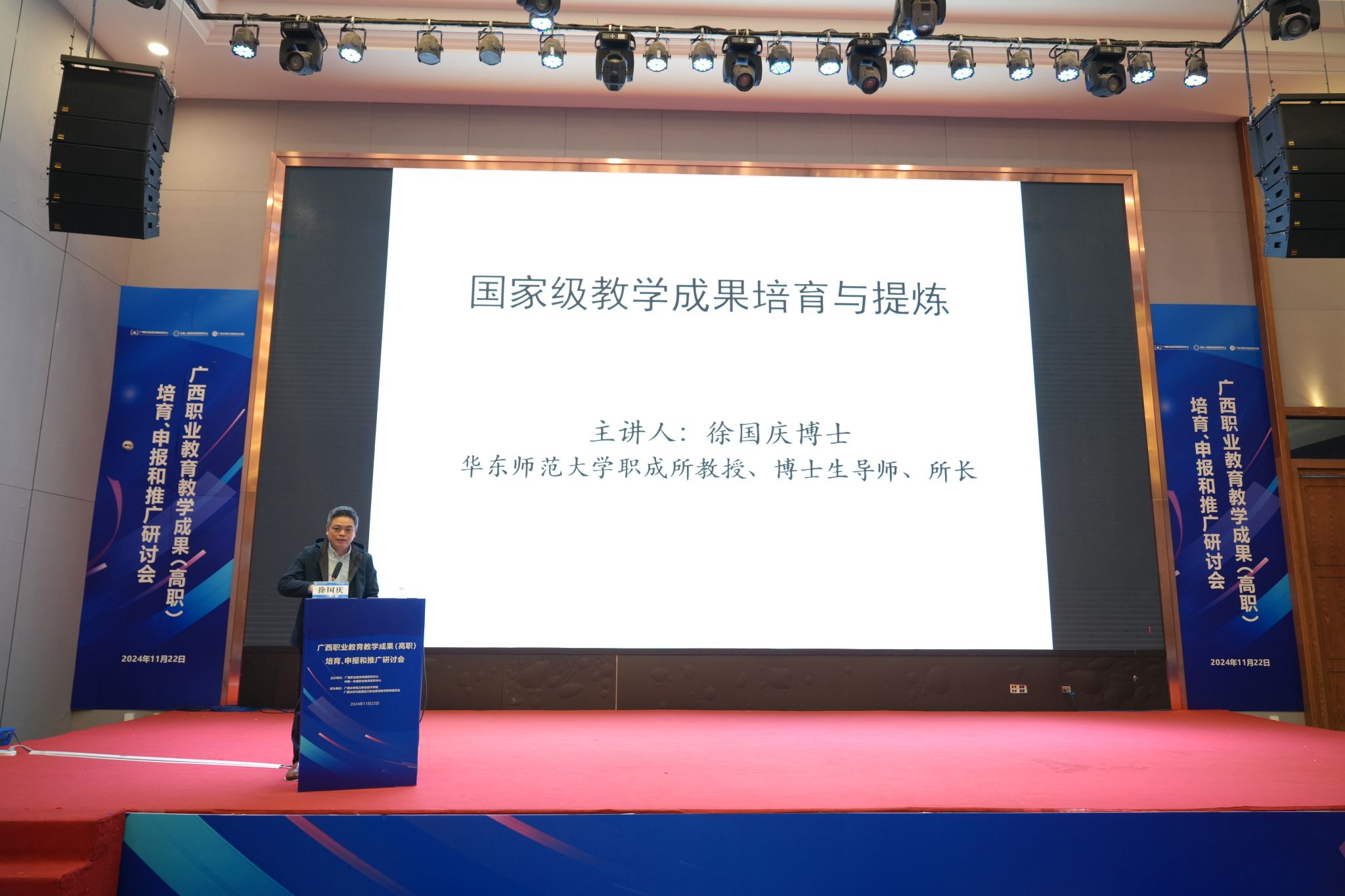 大会主旨报告环节,邀请了国内职业教育领域知名专家华东师范大学职业教育与成人教育研究所所长徐国庆教授做《国家级教学成果培育与提炼》主题报告,他围绕国家级教学成果的性质、培育、选题设计、成果的提炼与申报做了全面分析和深刻分享,并通过案例提出了许多具有实践价值的培育举措和申报建议。
