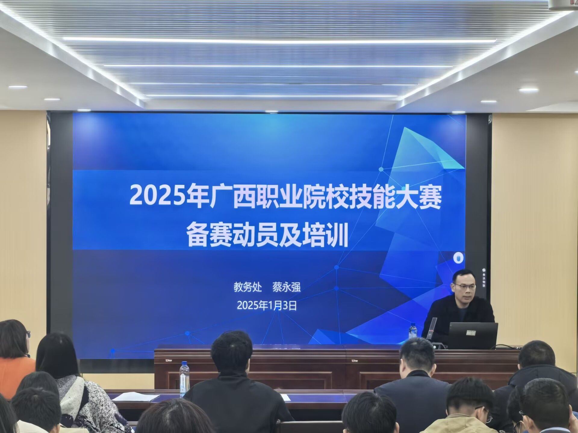 [本网讯]1月3日上午,学校在第四教学楼2-5室召开2025年广西职业院校技能大赛培训动员会,教务处处长蔡永强、副处长钟霞、各二级学院分管学生竞赛工作副院长、2024年世界职业院校技能大赛裁判人员、2025年广西职业院校技能大赛参赛赛项指导老师等60余人参会。会议由钟霞副处长主持。