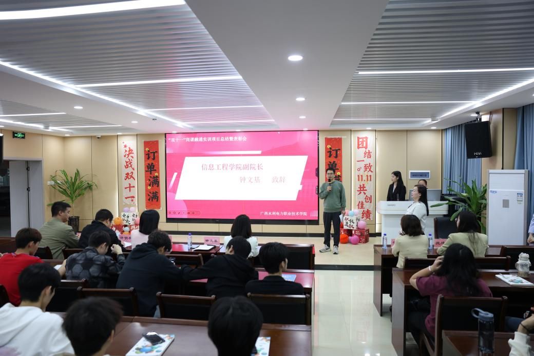 [本网讯]12月2日,学校信息工程学院举行2025年“双十一”岗课融通实训项目总结暨表彰大会。信息工程学院副院长(主持工作)钟文基、副院长黄晓芸、广西南宁百萃信息科技有限公司总经理戴琳、项目经理周文彬、桂林道客网络科技公司项目经理许明友、信息工程学院商务技术团队教师以及参加项目的电子商务专业学生参加了此次大会。