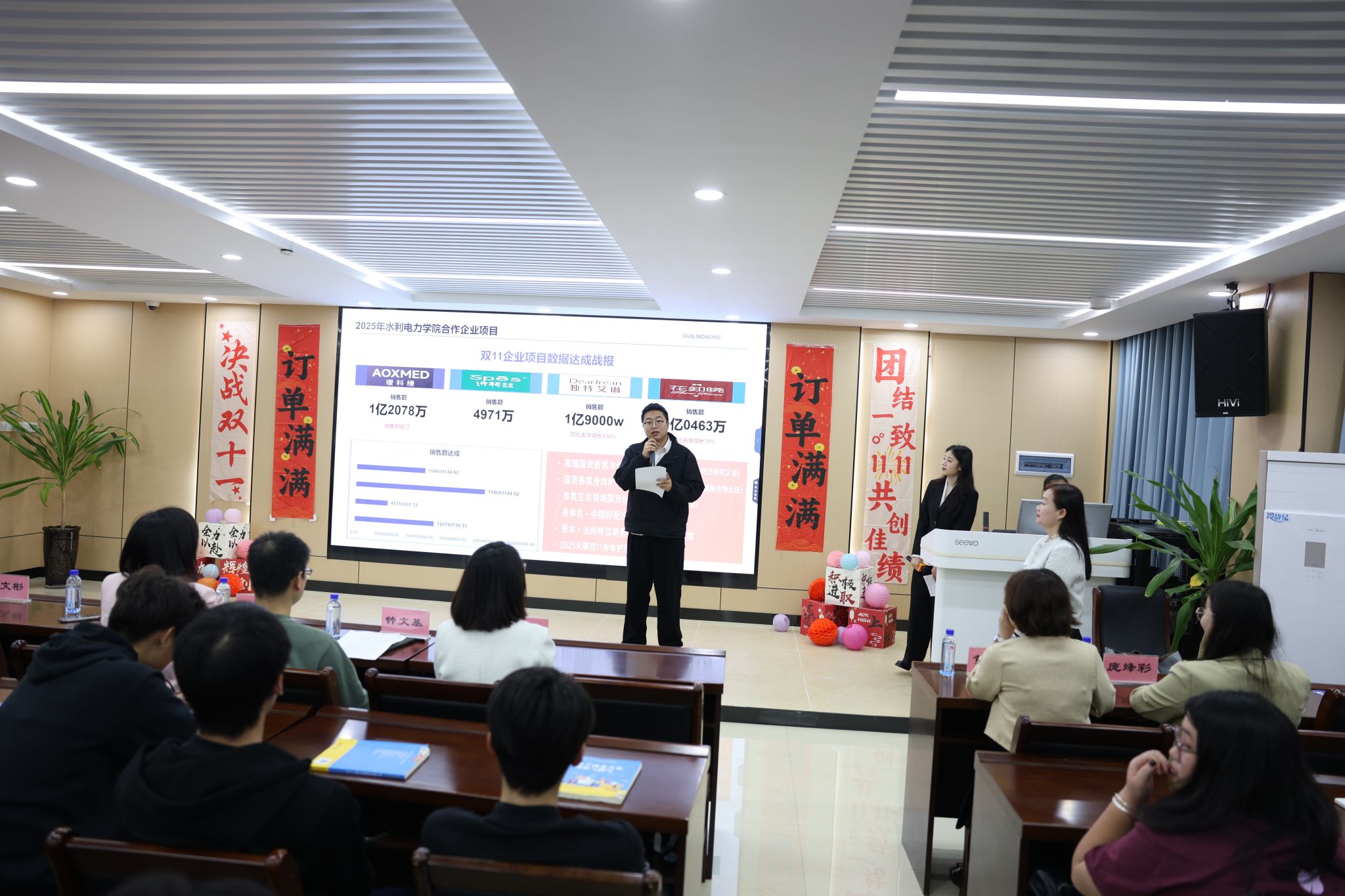 9月25日-11月20日期间,近140名电子商务专业学生参与“双十一”岗课融通实训项目,为花知晓、瑗科缦、诗裴丝、独特艾琳四个日化品牌提供临促云客服,累计服务客户超15万人次,创造销售额突破4亿元、顾客满意度88%的优异成绩。桂林道客网络科技公司项目经理许明友感谢学院对此次“双十一”岗课融通实训项目的参与和支持。他高度赞扬了参与实训项目的电子商务专业学生,对学生的表现和取得的优异成绩表示高度认可和感谢,并期待未来与学院开展更深入、更广泛的校企合作。24电商4班李湘同学作为本次“双十一”岗课融通实训项目的优秀学生代表在总结会上作发言,她表示在岗课融通实训这段时间收获了很多实践技能,未来她将持续精进专业技能,致力于成为新时代电子商务领域的人才。