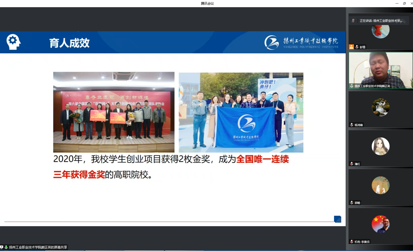本次培训讲座邀请了扬州工业职院创新创业学院颜正英院长为老师们开展“互联网+”大赛培训,讲座主题为《职业院校双创大赛与专创融合教育教学改革探索与实践》。颜院长从“互联网+”创业大赛校赛选拔、项目培育、大赛指导、评审规则、师资培养、备赛技巧、专创融合等方面进行介绍,结合多个国赛金奖项目的备赛情况进行详细分析。此外还介绍了扬州工业职院的创新创业教育体系建设情况及取得成效,包括双创学院建设、电商直播学院建设、双创课程建设、专创融合课程建设、双创基地建设等。