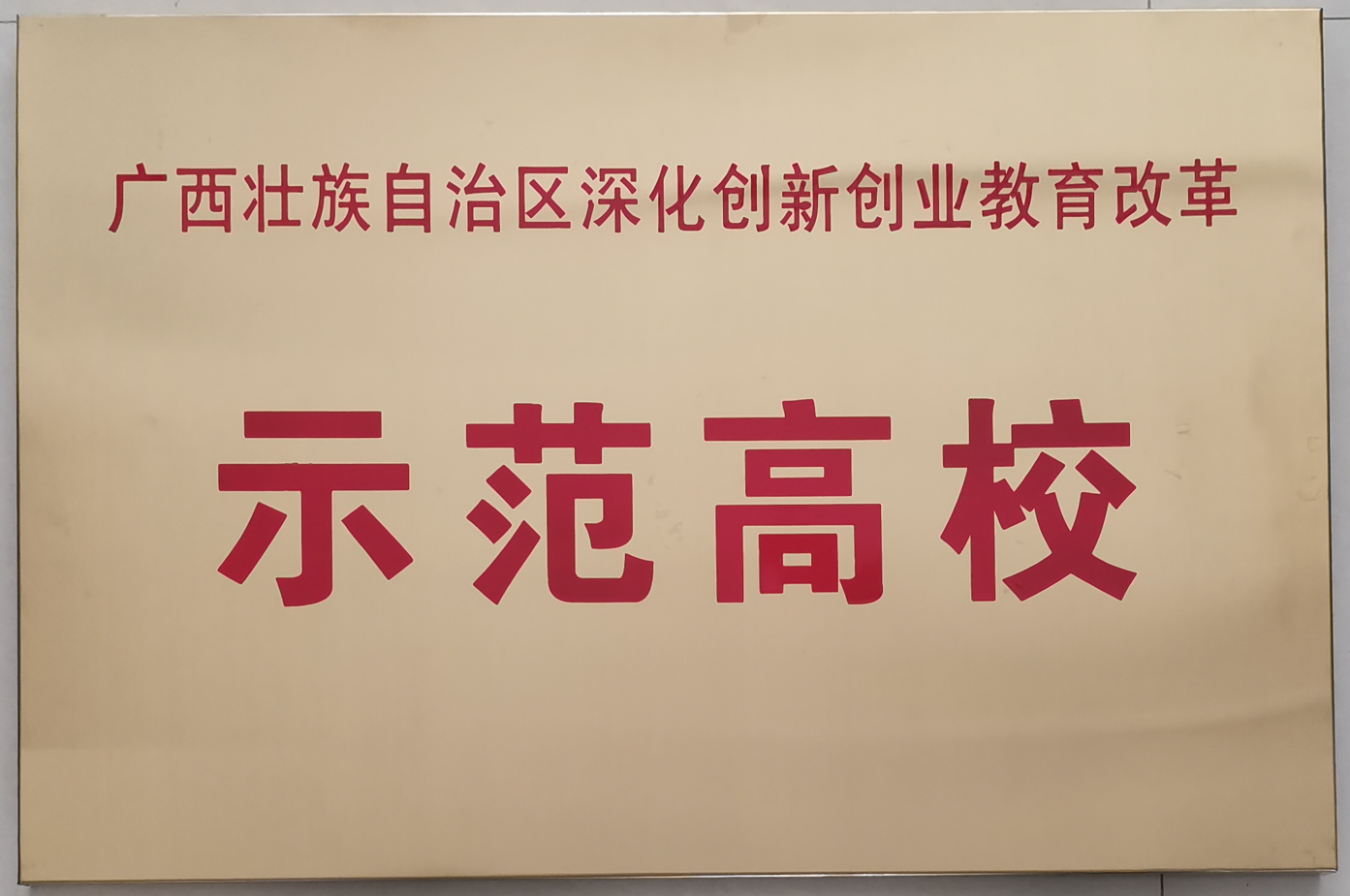 广西壮族自治区深化创新创业教育改革示范高校牌匾
