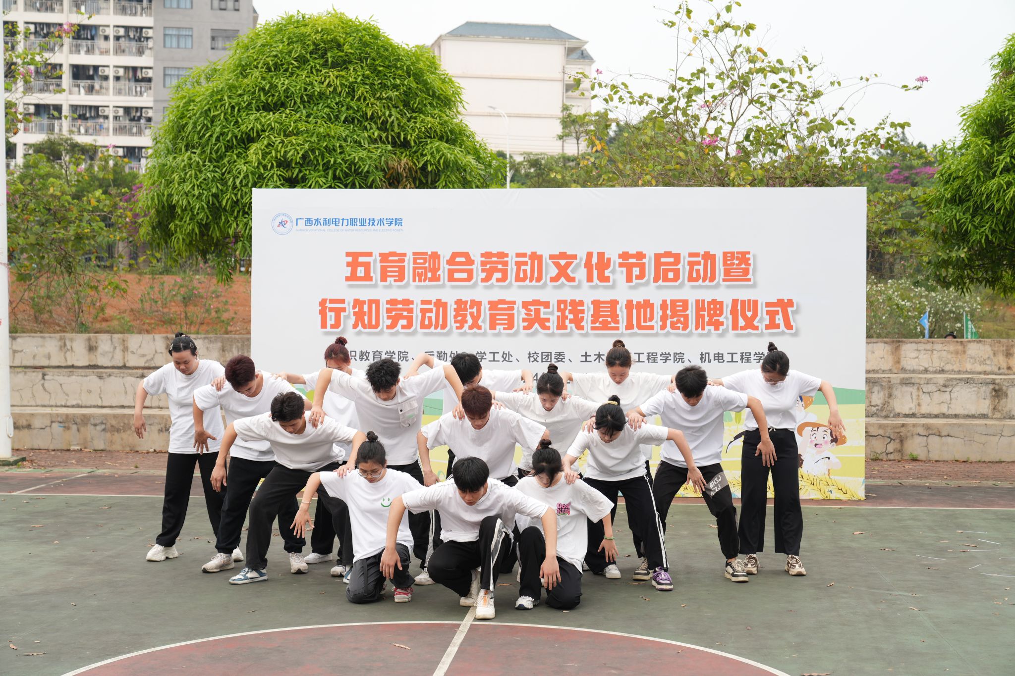 仪式开始,代表壮族先民对风调雨顺、五谷丰登殷切期盼的非遗舞蹈《蚂拐舞》瞬间将在场师生带入了田间地头。配合鼓点,师生们通过格调欢快、刚健有力的舞蹈动作,感受着壮族人民对劳动生活的热爱和对自然的敬畏。诗朗诵《劳动者之歌》展现了学校青年学子心怀凌云壮志,与时代脉搏共振,用劳动筑梦美好生活的昂扬姿态。