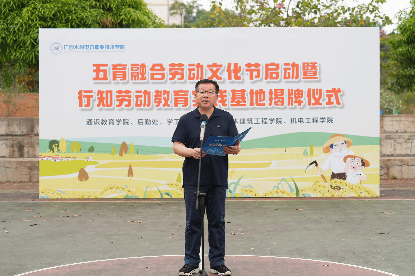 李林为仪式致辞。他指出,劳动是深深植根于中华民族血脉的精神基因,热爱劳动是中华民族的优秀传统,人世间的一切幸福都需要靠辛勤的劳动来创造。他强调,行知劳动教育实践基地的成立,一是让同学们有了亲手耕种、亲身体验农耕劳作不易的平台;二是希望同学们在实践中获得知识和智慧,在劳动中体验和感悟劳动的艰辛和收获的快乐,传承“行是知之始,知是行之成”的思想。最后,李林宣布五育融合劳动文化节正式启动,行知劳动教育实践基地正式成立,与通识教育学院院长韦弘一起共同为基地揭牌。
