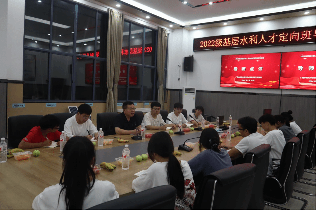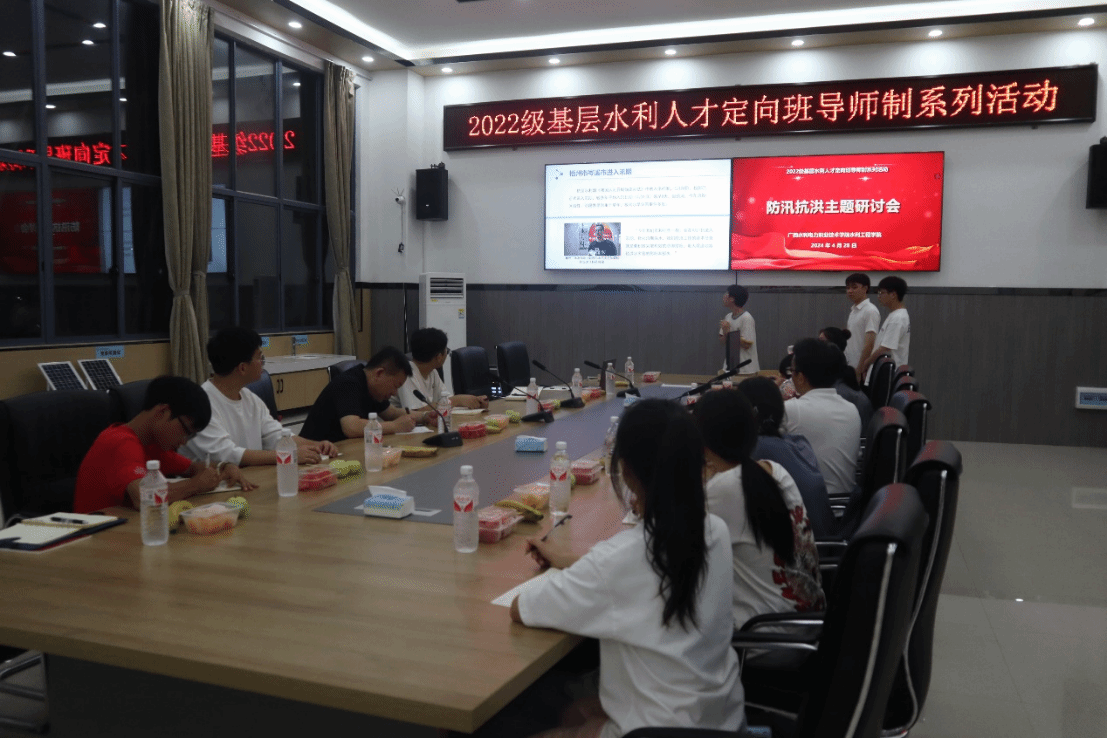 [本网讯]为全面贯彻国家教育方针,进一步提高基层水利人才专业综合素养,全力落实导师培养制度,4月28日晚,学校校长李林作为学生导师,在里建校区出席2022级基层水利人才定向班防汛抗洪主题研讨会,水利水电工程智能管理教学团队负责人韦庆华陪同参加。