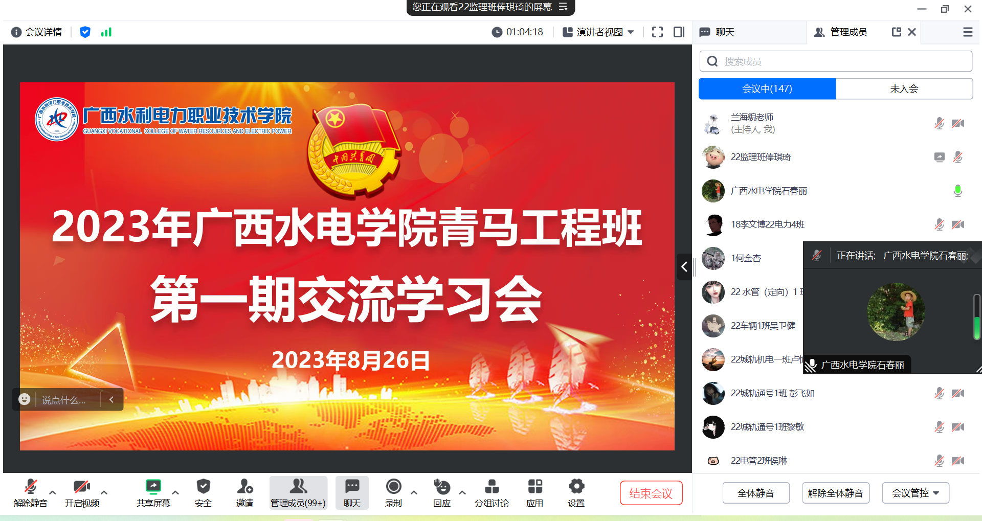 最后,学校团委书记石春丽指出:“青马工程班”学员要认真学习团十九大精神,积极通过“学习强国”“广西青年圈”“智慧团建”等平台学习时事政治,勇于投身政务实习、社会实践、志愿服务的工作中,为党做好新时代青年应尽的责任,走好新的百年青春征程“赶考之路”。