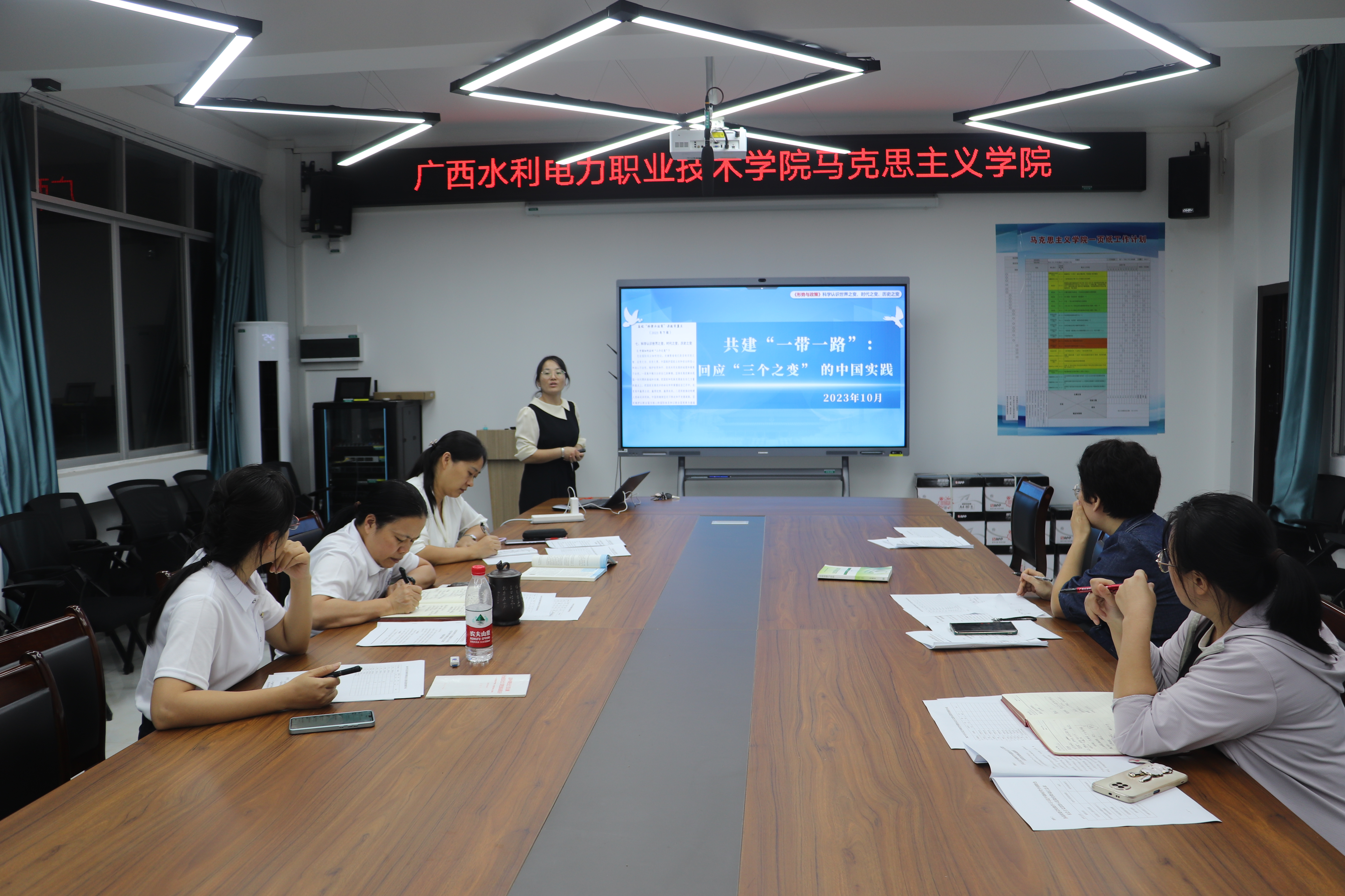 [本网讯]为选拔优秀教师和优秀作品参加近期教育厅主办的两项教学比赛,全面提升参赛水平,优中选优,以赛促教,10月23日晚,马克思主义学院在长堽校区举行2023年学习贯彻习近平新时代中国特色社会主义思想示范课堂建设暨全区军事课教学竞赛初赛,共16位青年教师参赛。马克思主义学院院长李春萌、院长助理徐坚及各教学团队负责人担任两项比赛的评委。