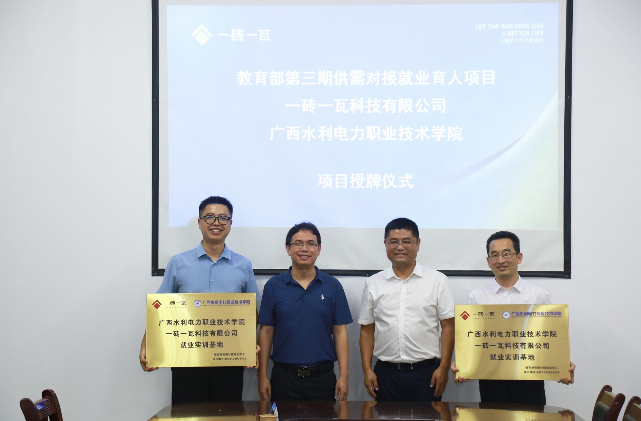 [本网讯]7月4日下午,教育部第三期供需对接就业育人项目授牌仪式在长堽校区电力实训楼举行。学校副校长刘存香、一砖一瓦科技有限公司总经理容绍波、广西一砖一瓦教育科技有限公司总经理付道慧出席活动。活动由土木建筑工程学院副院长唐善德主持。