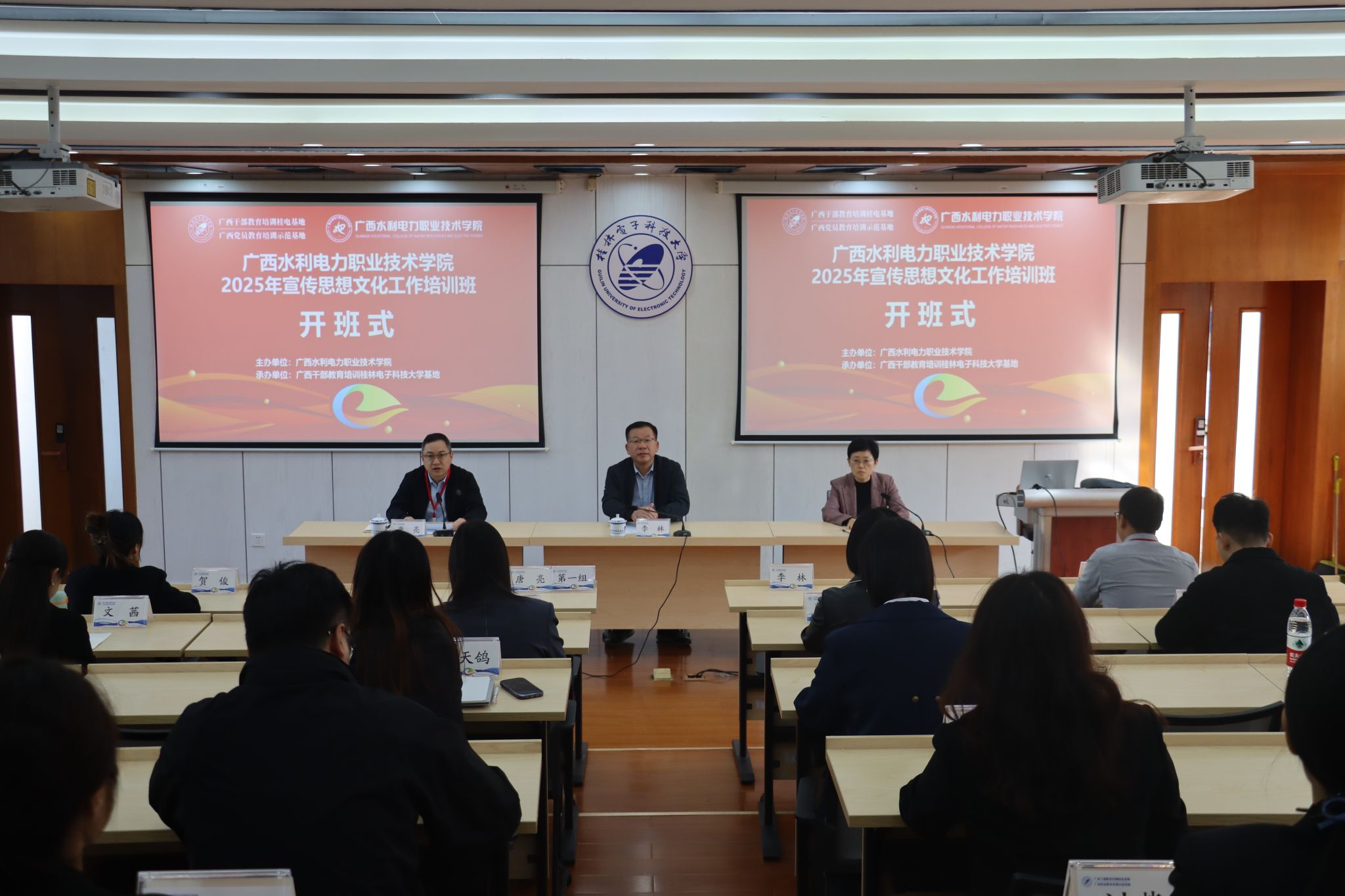 [本网讯]11月24-27日,学校2025年宣传思想文化工作队伍培训班在桂林电子科技大学举行。学校党委书记李林出席开班式并作动员讲话,桂林电子科技大学党委副书记聂慧致辞。pp电子党委宣传部部长唐亮主持开班式。