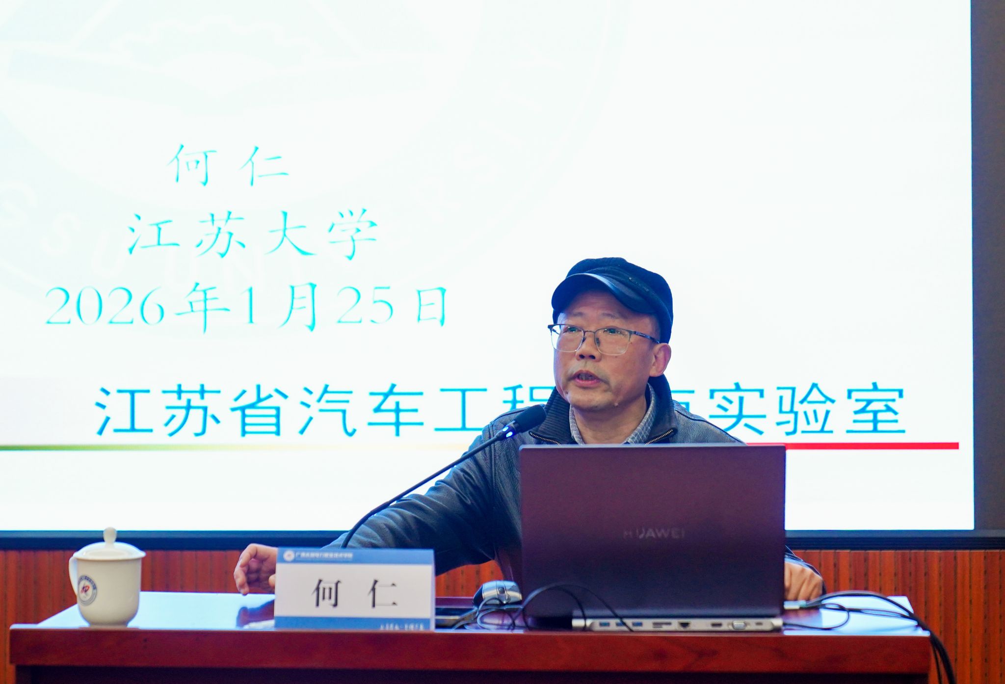 何仁教授作以《油电混合动力汽车燃油蒸发近零排放控制技术》为主题的报告,围绕目前汽车蒸发排放技术状况、油电混合动力汽车燃油蒸发近零排放技术等内容做了系统而详细的阐述。在交流环节,何教授结合自身经验,就如何申报高层级科技项目等问题做了解答。随后,何教授到里建校区参观调研,为学校实验实训室的建设提出了建设性的指导意见和建议。