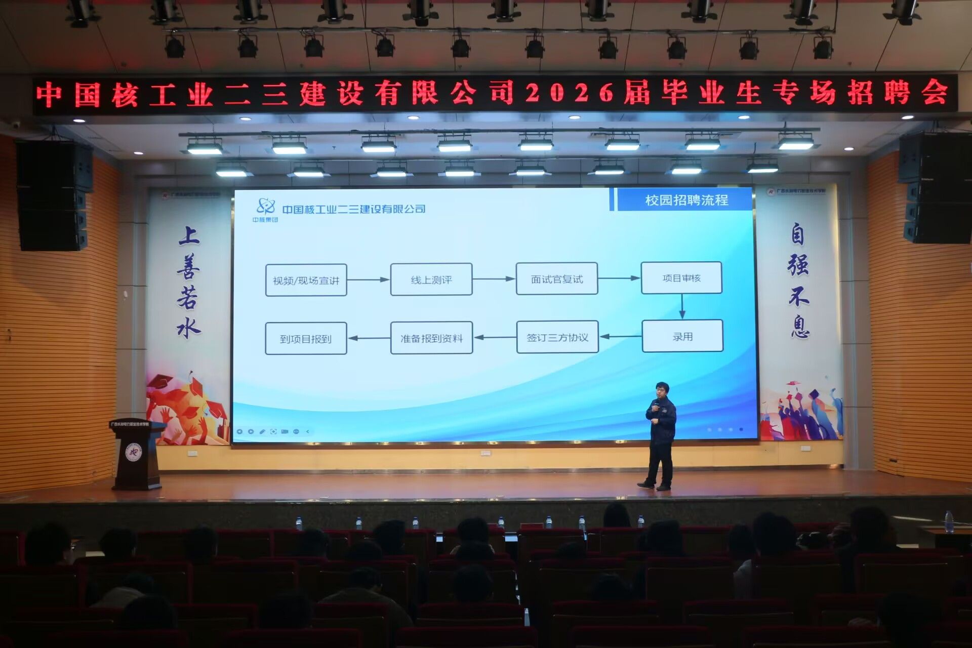 [本网讯]为拓宽毕业生就业渠道,搭建学生与优质企业的沟通平台。11月27日,中国核工业二三建设有限公司到里建校区青年之家学术报告厅举办专场宣讲会。宣讲会由中国核工业二三建设有限公司招聘经理王家旺主讲,水利工程学院副院长彭聪、毕业生辅导员、2026届在校毕业生参加活动。