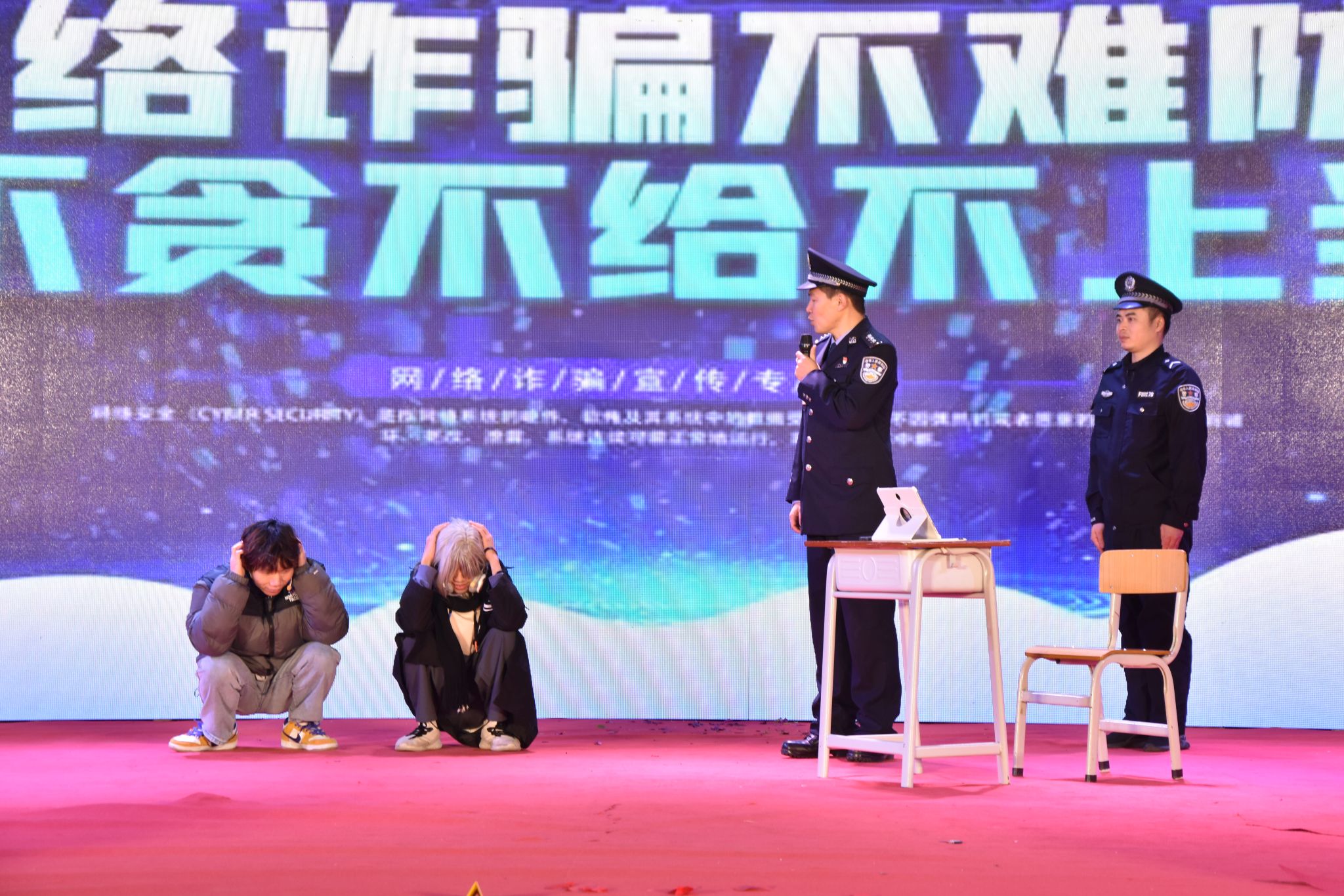 与南宁市公安局里建派出所李元生警官共同表演的反诈骗小品《魔高一尺 道高一丈》