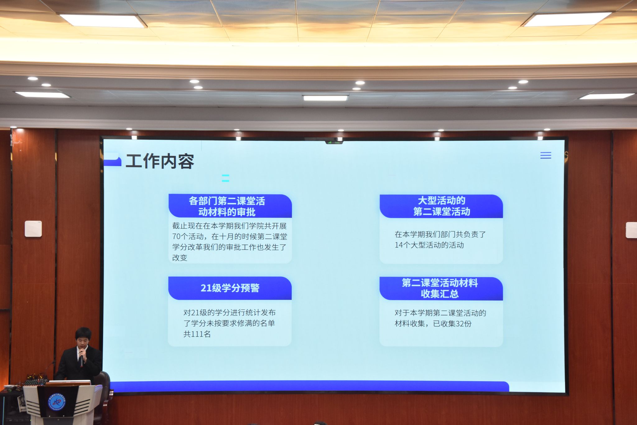 会议上,各部门代表从2023年开展的工作、工作中存在的不足和2024年的工作计划三个方面进行了汇报,挖掘了工作的亮点,也深刻剖析了工作中存在的不足,并提出了相应的解决措施和未来规划。机电工程学院团委书记韦微对各部门的工作予以肯定,对所有工作人员的付出表示感谢,同时寄语全体工作人员:希望大家未来能继续秉持全心全意为同学服务的宗旨,再接再厉,再创佳绩。