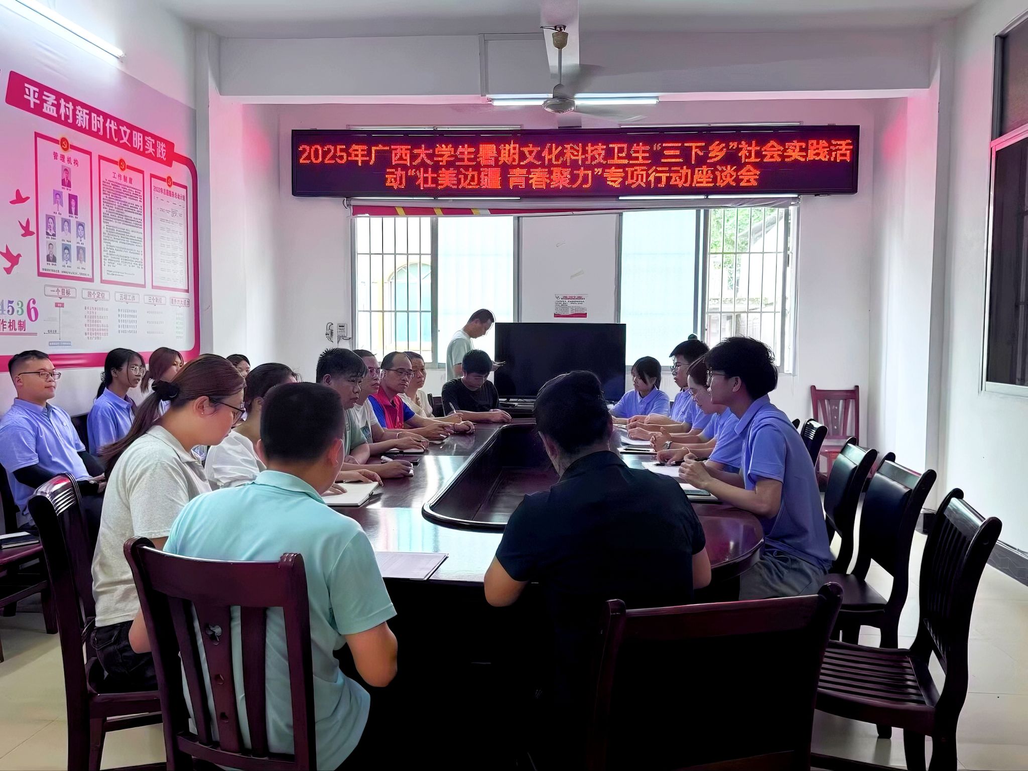 服务团联合平孟镇团委以及平孟村村委开展“边疆发展青年对话会”。双方聚焦本次“壮美边疆 青春聚力”的主题,就边境地区产业发展、文化传承、生态保护等议题展开深入交流。平孟村党支部书记梁飞行介绍:“平孟村作为祖国南疆的重要门户,近年来通过‘党建+边防’模式,实现了稳边固边与民生改善的协同发展”。服务团成员结合机电一体化技术等专业优势,通过提出常态化开展义务维修、时光印刻、村容村貌改造工程等实践活动方案,服务边疆乡村民众。